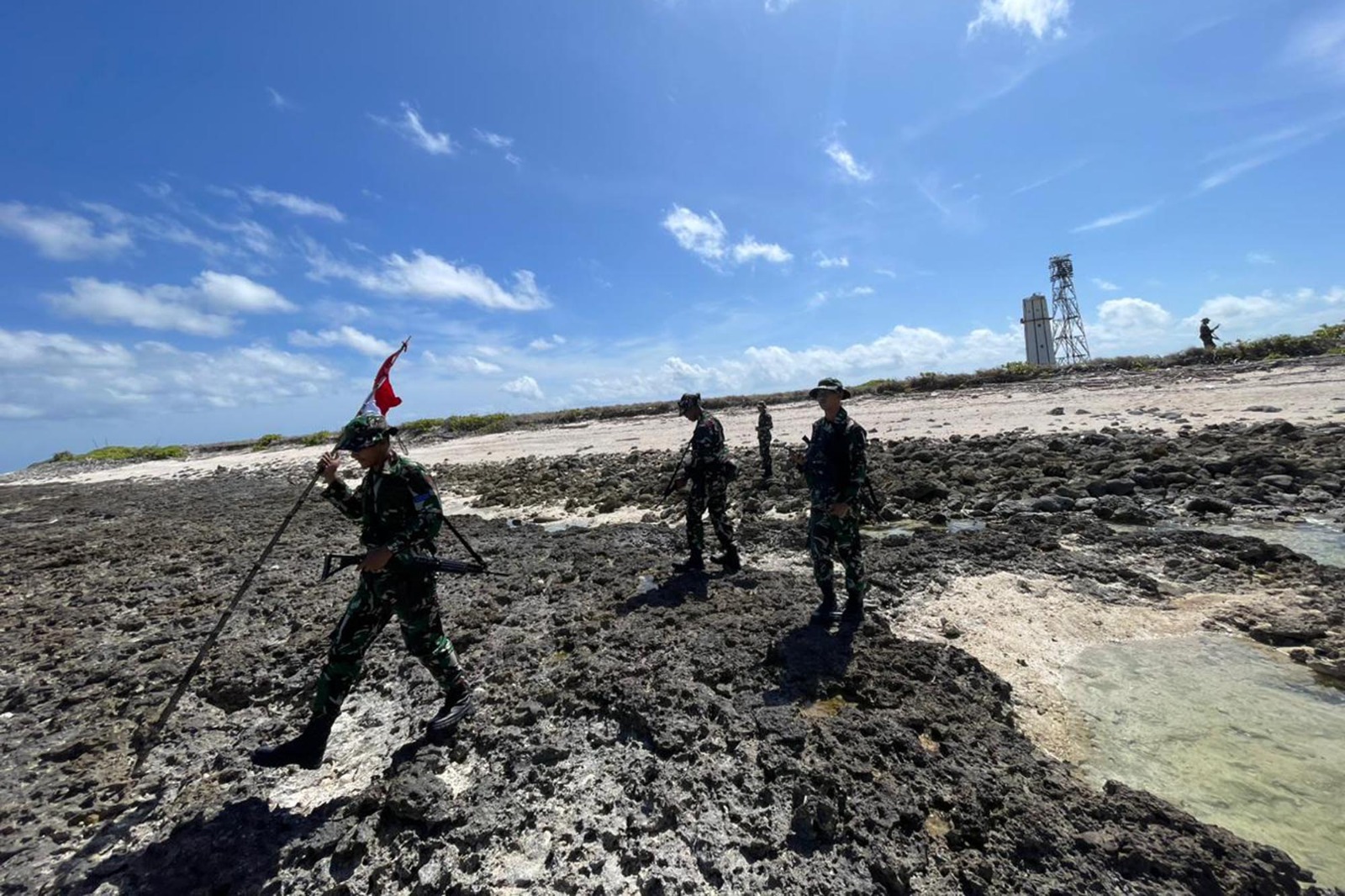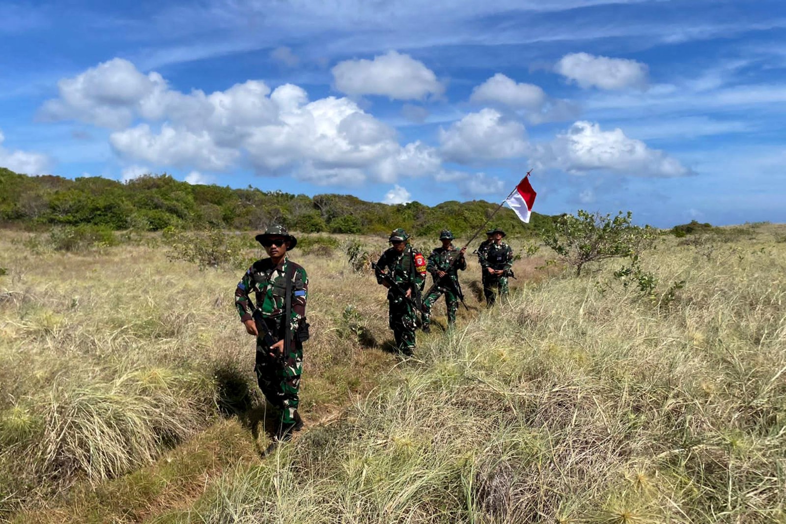 TNI AL, Dispen Pasmar 2 (Rote Ndao). Guna mengantisipasi adanya sabotase, Satgasmar Puter XXVIII TA.2024 Pulau Ndana melaksanakan patroli di sepanjang pesisir pantai dan jalan hutan pulau Ndana, Kab. Rote Ndao, Kupang, Nusa Tenggara Timur. Kamis (04/07/2024).