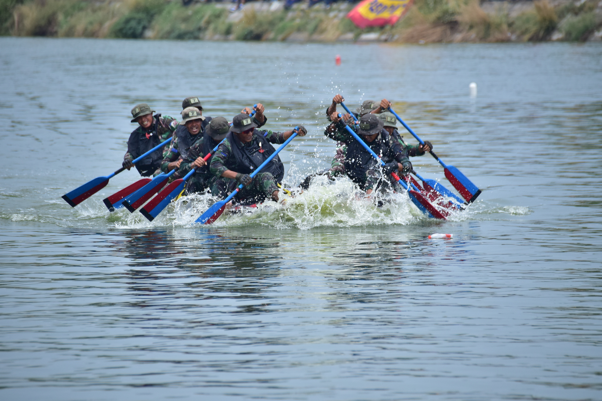 Nampak masyarakat yang menyaksikan berjalannya lomba memberikan dukungannya kepada para Kesatria Baret ungu yang bejuang menjadi yang tercepat dalam Lomba Dayung 1000 meter.