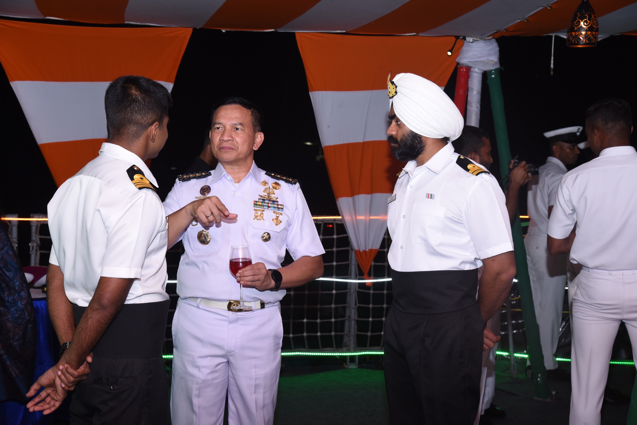 Dispen Kormar TNI Angkatan Laut (Jakarta). Komandan Korps Marinir Mayor Jenderal TNI (Mar) Dr. Endi Supardi, S.E., M.M., M.Tr.Opsla., CHRMP., CRMP., diwakili Askomlek Dankormar Kolonel Marinir Didiet Hendra Wijaya, M.Mp., dan Wakil Komandan Korps marinir Brigadir Jenderal TNI (Mar) Muhammad Nadir, M.Tr.Opsla., diwakili Kadis Komplek Letkol Mar Ade Lesmono, M.Tr.Opsla., menghadiri undangan Dubes India untuk Indonesia Deck Reception onboard the Ship atau makan malam di atas kapal perang India dalam rangka Kunjungan Kapal Perang INS Sandhayak di Dermaga 107, Tanjung Priok, Jakarta Utara. Rabu (23/07/2025).
