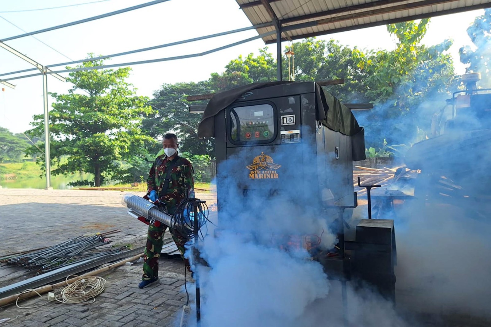 TNI AL Dispen Kormar (Surabaya) Dalam upaya mengantisipasi dan cegah dini bahaya Demam Berdarah Dengue (DBD) serta peduli akan kesehatan, Batalyon Intai Amfibi 2 Marinir (Yontaifib 2 Mar) melaksanakan penyemprotan fogging di seluruh area Batalyon Intai Amfibi 2 Marinir, Kesatrian Sutedi Senaputra, Karangpilang, Surabaya, Jawa Timur. Rabu (08/05/2024).