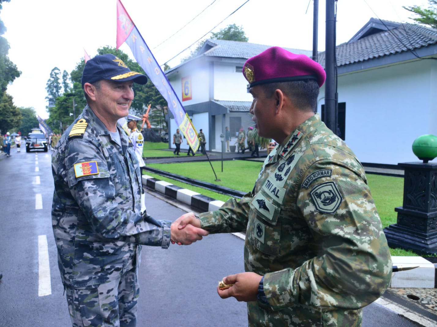 Setibanya di Sarang Petarung Marinir, Chief of Australian Defence Force dan Panglima TNI disambut hangat oleh Kepala Staf Angkatan Laut Laksamana TNI Dr. Muhammad Ali, S.E., M.M., M.Tr.Opsla., didampingi Panglima Korps Marinir (Pangkormar) Letnan Jenderal TNI (Mar) Dr. Endi Supardi, S.E., M.M., M.Tr.Opsla., CHRMP., CRMP. Kegiatan diawali dengan jajar kehormatan, sambutan selamat datang, serta penayangan profil Korps Marinir yang menampilkan kiprah dan profesionalisme prajurit Baret Ungu.