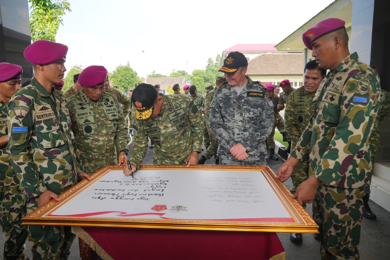 Dispen Kormar TNI Angkatan Laut. (Jakarta). Chief of Australian Defence Force (ADF) Admiral David Johnston bersama Panglima TNI Jenderal TNI Agus Subiyanto, S.E., M.Si. melaksanakan kunjungan ke Sarang Petarung Marinir di Kesatrian Marinir Hartono, Cilandak, Jakarta Selatan, pada Kamis (16/10/2025). Kunjungan ini menjadi momentum penting dalam mempererat hubungan pertahanan antara Tentara Nasional Indonesia (TNI) dan Australian Defence Force (ADF).