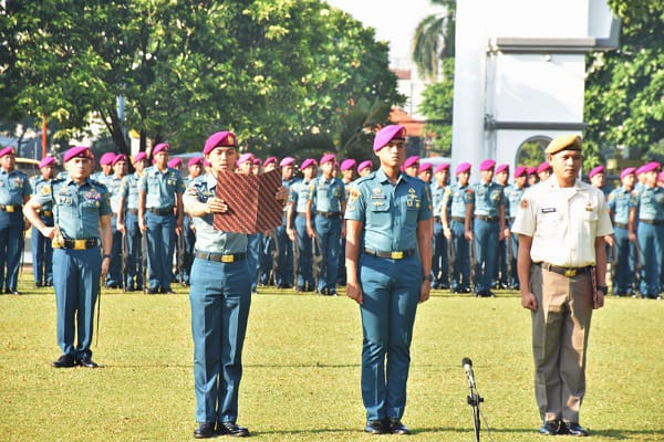 Dispen Kormar TNI Angkatan Laut (Jakarta). Komandan Denma Markas Komando Korps Marinir (Dandenma Mako Kormar) Kolonel Mar Andi Ichsan, S.H., M.Tr. Hanla., M.M., CRMP., bertindak selaku inspektur upacara pada upacara penaikkan bendera Merah Putih, di lapangan apel Mako Kormar jl. Prajurit KKO Usman dan Harun No. 40 Jakarta Pusat, Rabu (17/07/2024).