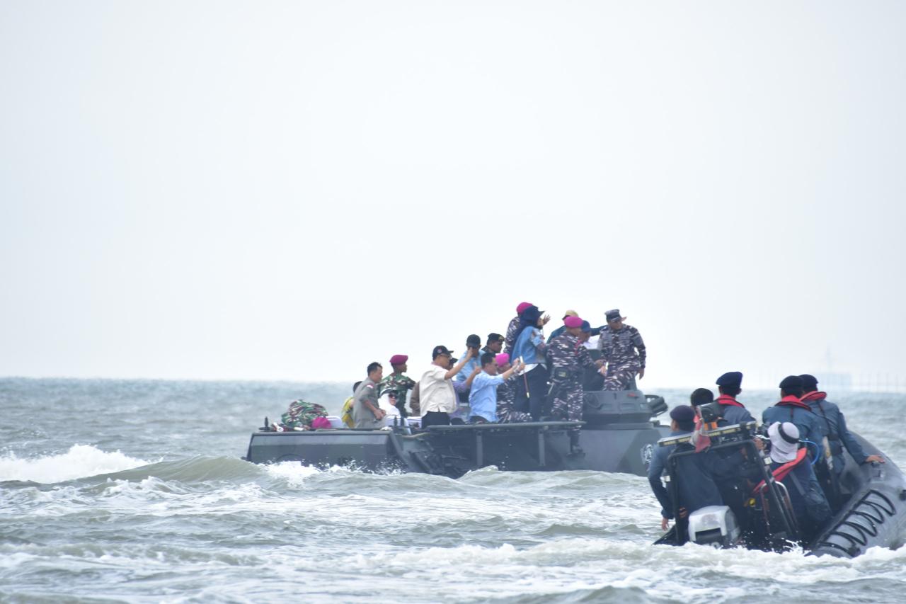 Dispen Kormar TNI Angkatan Laut (Jakarta). Komandan Korps Marinir (Dankormar) Mayjen TNI (Mar) Dr. Endi Supardi, S.E., M.M., M.Tr.Opsla., CHRMP., CRMP., mendampingi Kepala Staf Angkatan Laut (Kasal) Laksamana TNI Dr. Muhammad Ali, S.E., M.M., M.Tr.Opsla., dan Ketua Komisi IV DPR RI Titik Hedieti Soeharto, S.E., pimpin pembongkaran pagar laut di perairan Tanjung Pasir Tangerang Banten, Rabu (22/01/2025).