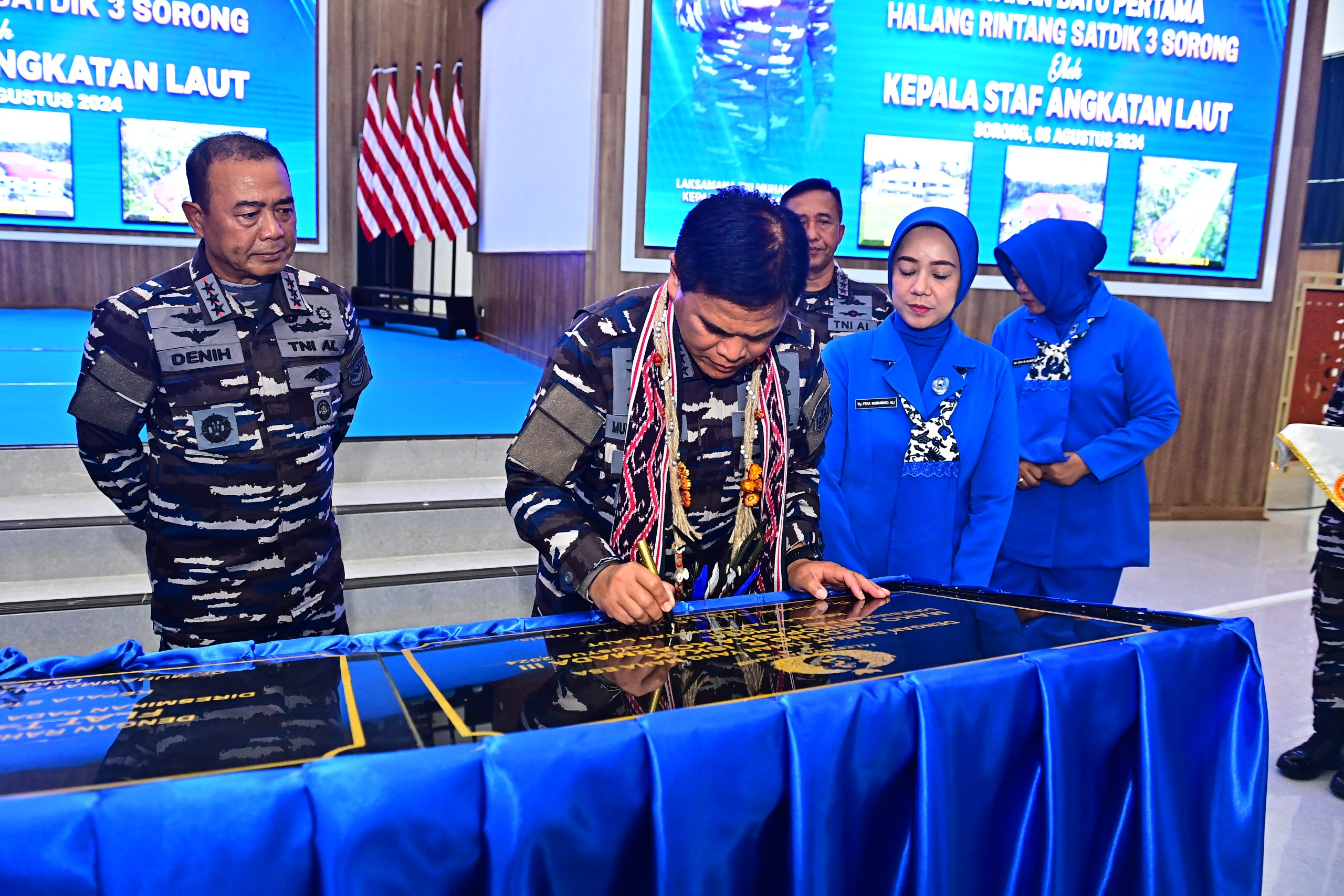 Usai tatap muka, Komandan Korps Marinir yang didampingi Ketua Gabungan Jalasenastri Korps Marinir Ny.Nana Endi Supardi mengikuti kegiatan penadatanganan peresmian Gedung Satkopaska dan Gedung Mess Perwira tipe 45 Koarmada III dan pembangunan halang rintang Satdik 3 Sorong oleh Laksamana TNI Dr. Muhammad Ali, S.E., M.M., M.Tr.Opsla.