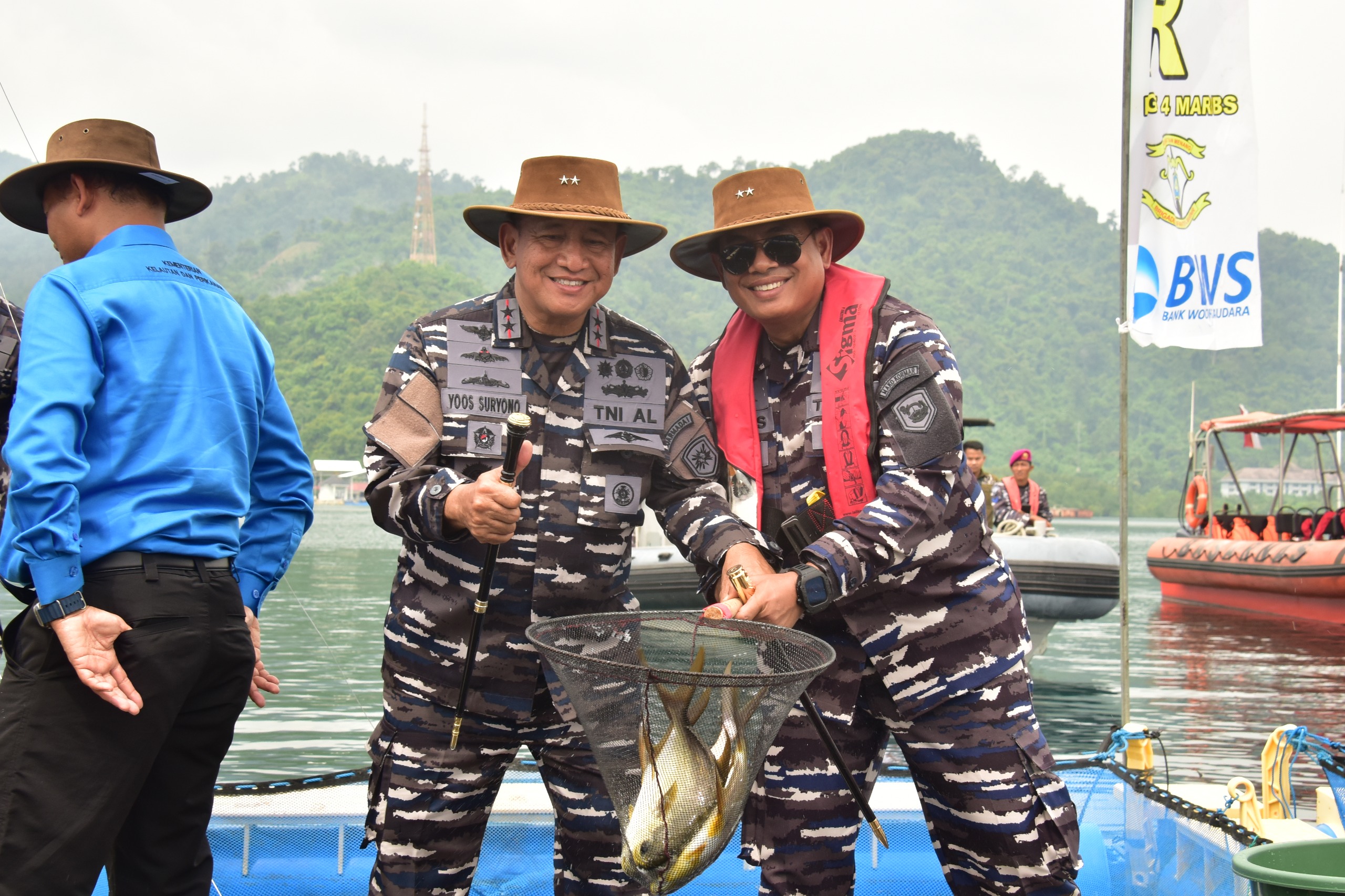 Setelah meninjau green house selanjutnya rombongan menggunakan searider menuju keramba jaring apung untuk memanen ikan bawal bintang dan menabur 5000 ekor benih ikan kembali. Sementara itu ditempat yang berbeda Ketua Umum Jalasenastri dan rombongan memisahkan diri dengan menggunakan jalur darat meninjau TK Hang Tuah. Di sana rombongan para ibu juga disambut dengan Drumband dan Tari TK Hang Tuah.