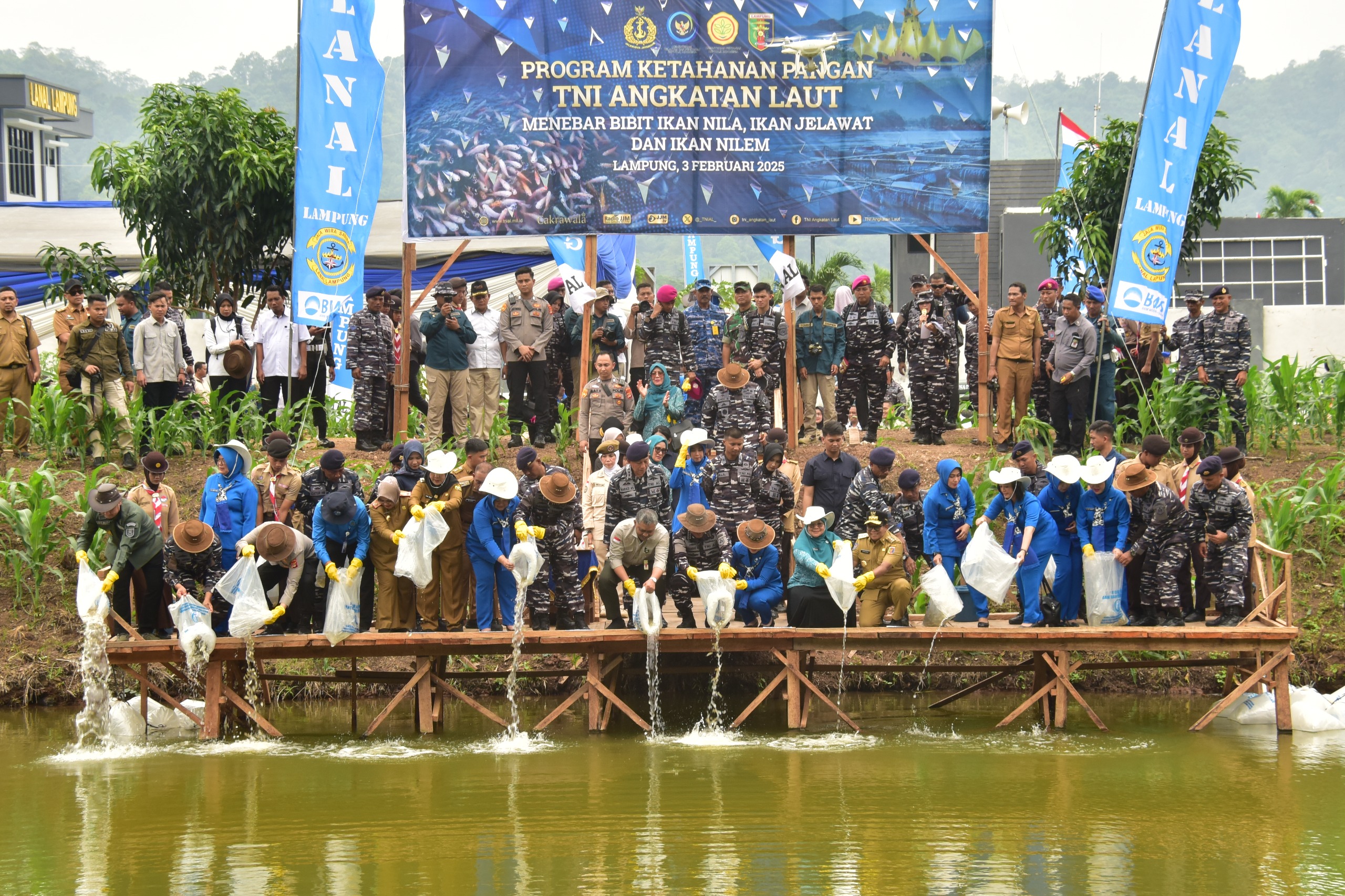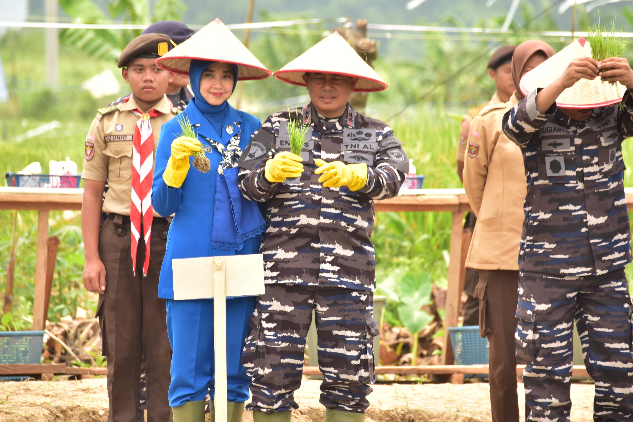 Setelah kembali bergabung dengan rombongan Kasal kegiatan dilanjutkan dengan penanaman padi dan penaburan benih ikan lele di lahan ketahanan pangan Lanal Lampung kemudian dilanjutkan menuju dilahan ketahanan pangan Brigif 4 Mar/BS untuk melaksanakan Panen Padi, hasil panen ini akan dijadikan sebagai bahan dalam program Makan Bergizi Gratis (MBG) untuk para murid sekolah.