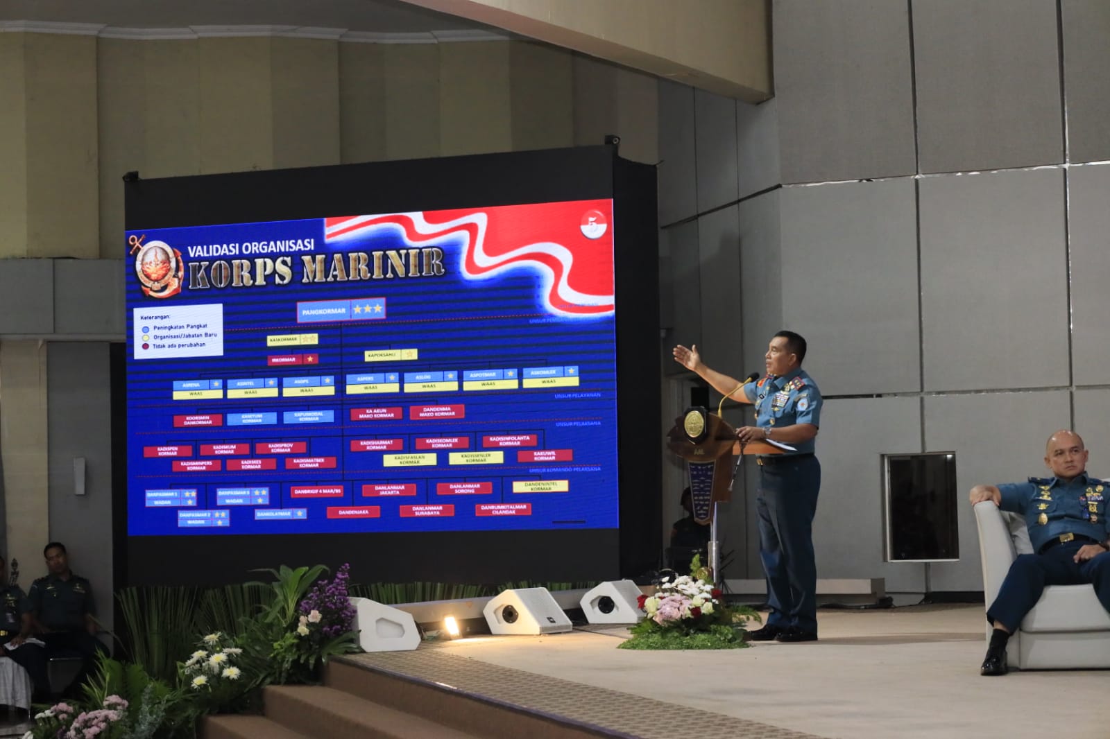 Dalam kegiatan tersebut, turut hadir Asisten Operasi Kepala Staf Angkatan Laut (Asops Kasal) Laksamana Muda TNI Yayan Sofiyan, S.T., M.Si., M.Tr.Opsla., yang juga menjadi narasumber sebagai Pembina Korps Pelaut. Komandan Korps Marinir mengawali pembekalannya dengan pemutaran video profil Korps Marinir, yang dilanjutkan dengan penjelasan mengenai struktur organisasi, rencana validasi organisasi Korps Marinir, serta tantangan penugasan bagi Perwira Remaja TNI AL.