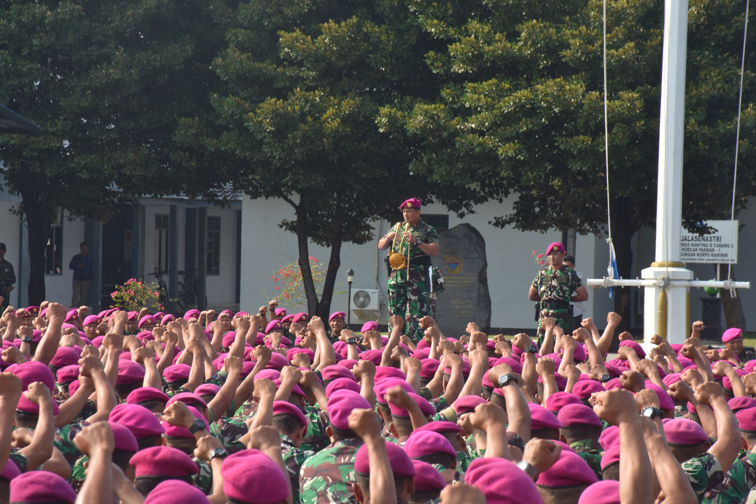 Dispen Kormar TNI Angkatan Laut (Jakarta). Komandan Korps Marinir (Dankormar) Mayjen TNI (Mar) Dr. Endi Supardi, S.E., M.M., M.Tr.Opsla., CHRMP., CRMP., pimpin Apel Khusus Prajurit Korps Marinir pasca peringatan HUT ke-79 TNI bertempat di Lapangan Apel Brigif 1 Marinir Cilandak Jakarta Selatan, Senin (07/10/2024).
