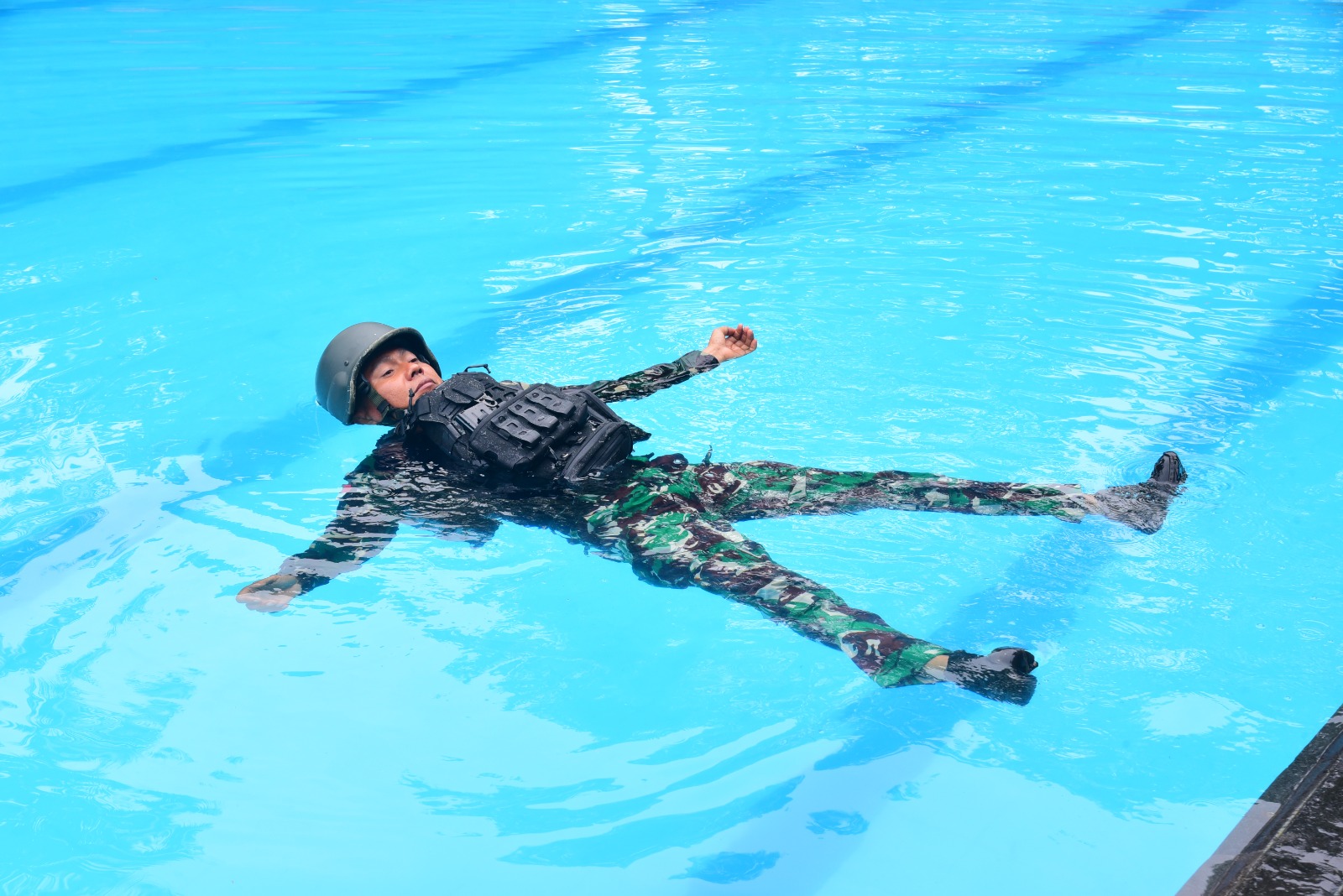 Dispen Kormar TNI Angkatan Laut (Jakarta). Komandan Korps Marinir (Dankormar) Mayjen TNI (Mar) Dr. Endi Supardi, S.E., M.M., M.Tr.Opsla., CHRMP., CRMP., meninjau langsung Uji Fungsi Rompi Anti-Peluru Apung bersama Tim Surveyor Dinas Kelaikan Material Angkatan Laut (Dislaikmatal), Dinas Perbekalan Angkatan Laut (Disbekal) bekerjasama dengan PT Indo Artha Magenta di lapangan Tembak Pistol Jusman Puger dan Kolam Renang Kestrian Marinir Hartono, Cilandak, Jakarta Selatan. Rabu (04/12/2024).