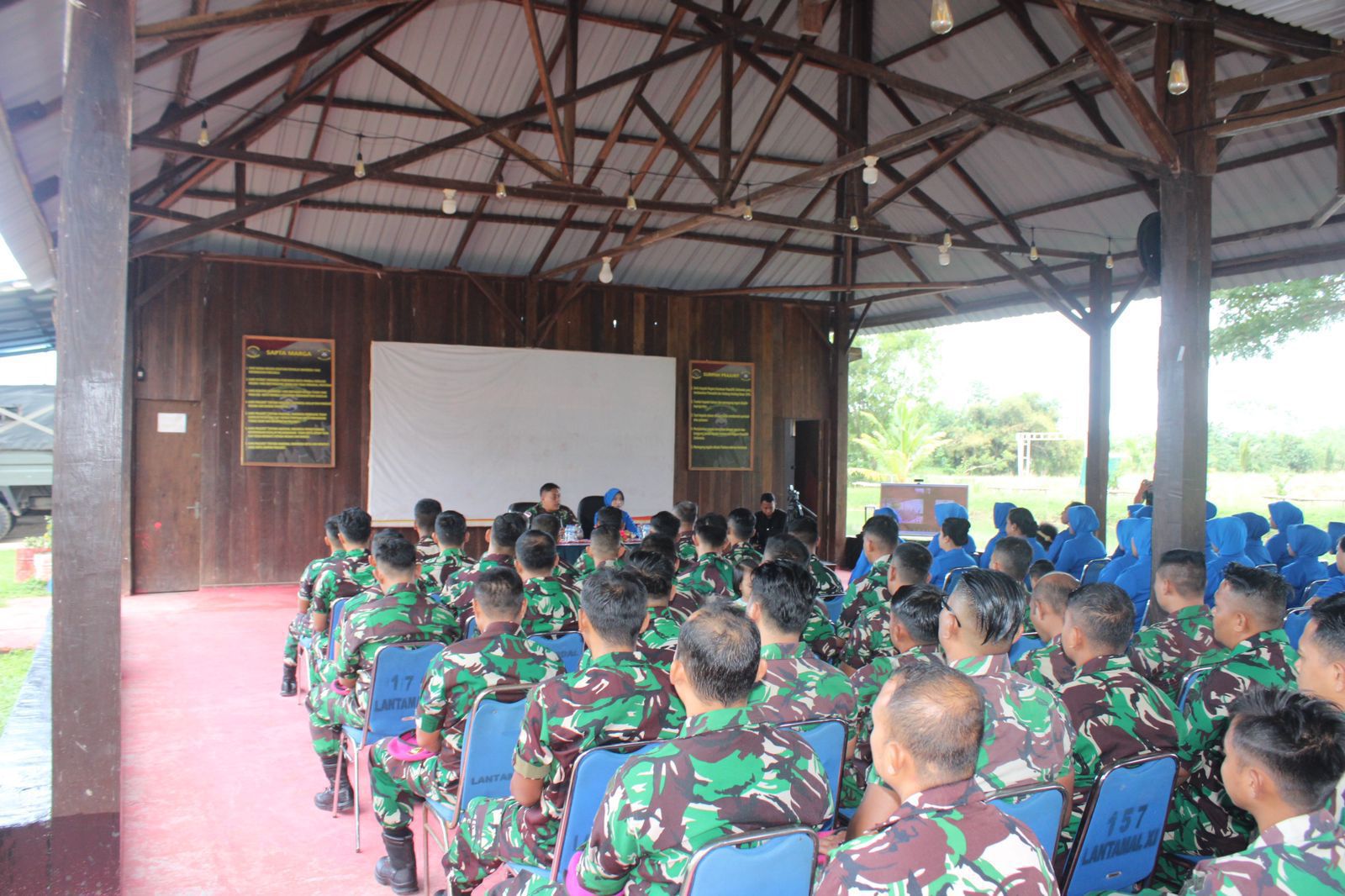 TNI AL, Dispen Korps Marinir (Merauke). Dalam rangka menjaga dan memonitoring seluruh prajurit, Mayor Marinir Deni Kusmana selaku Danyonmarhanlan XI memberikan pengarahan atau jam Komandan kepada seluruh prajurit dan Jalasenastri di Pendopo Yonmarhanlan XI, JL. Diko 1 Trans Irian Wasur, Rimba Jaya, Distrik Merauke, Kab. Merauke, Papua Selatan. Selasa (02/07/2024).