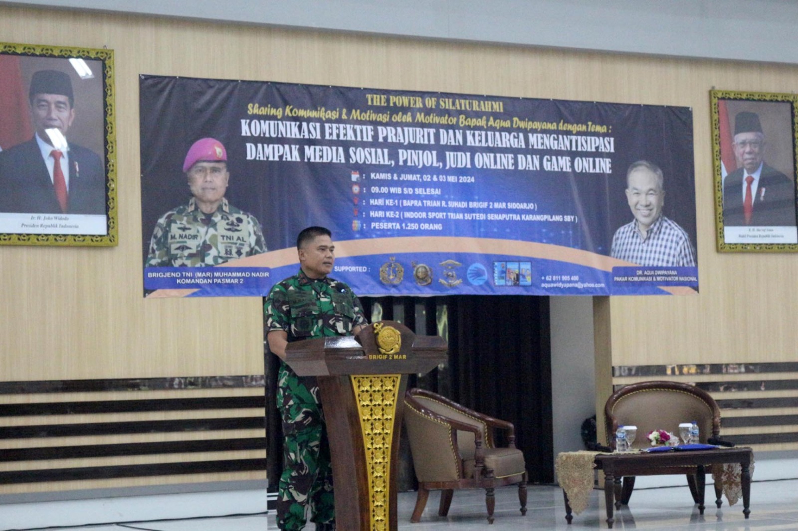 TNI AL, Dispen Kormar (Sidoarjo) Komandan Batalyon Infanteri 1 Marinir Letkol Marinir Roni Saputra, M.Tr.Opsla bersama Prajurit menerima Sharing Komunikasi Efektif Prajurit dan Keluarga mengantisipasi  dampak Judi Online, Pinjam Online dan Game Online oleh Bapak DR. Aqua Dwipayana di Gedung Edianto Balai Prajurit Kesatrian Marinir R. Suhadi Gedangan Sidoarjo Jawa Timur. Kamis (02/05/2024).