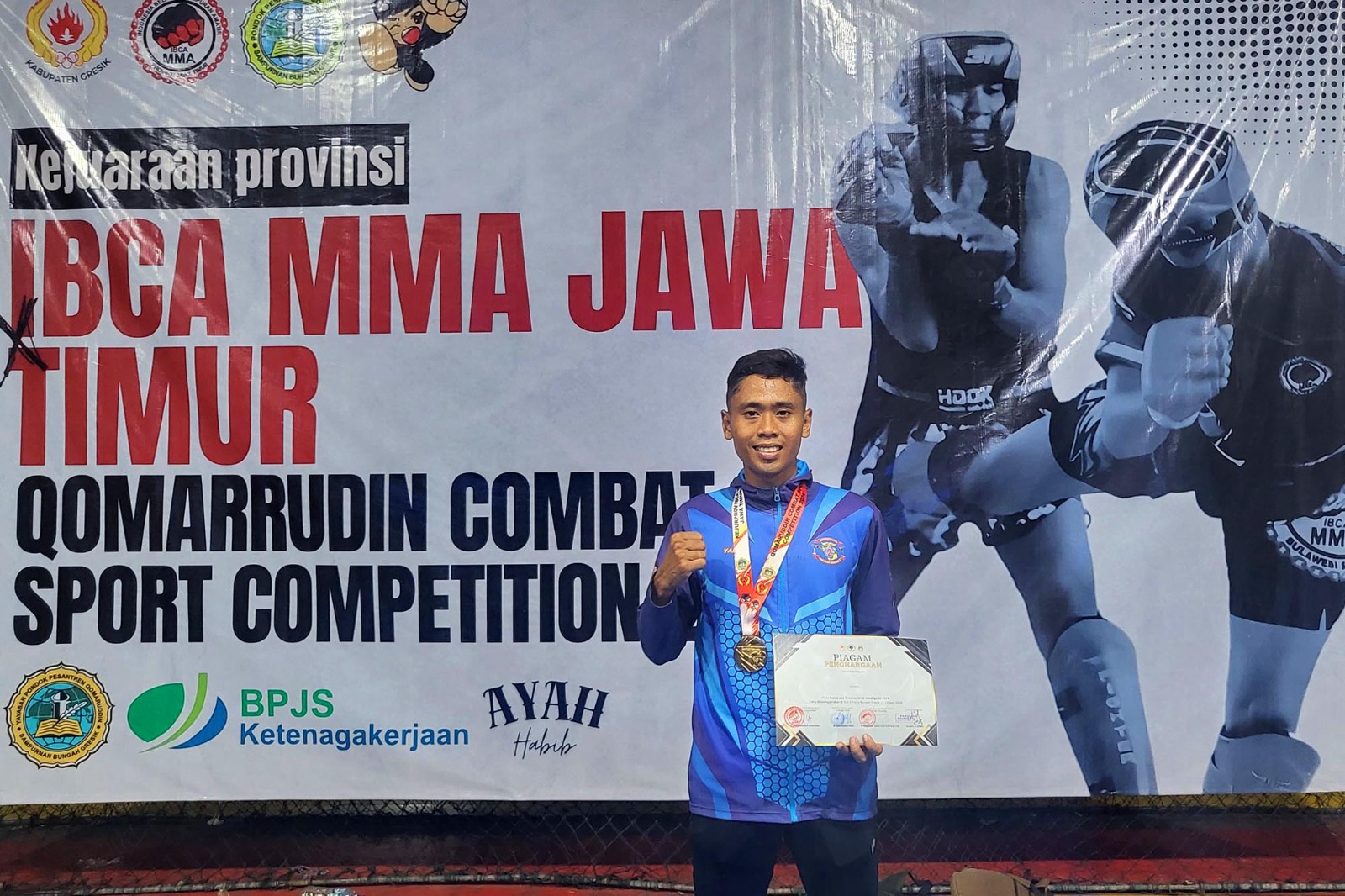 TNI AL, Dispen Kormar (Gresik). Prajurit Batalyon Infanteri 5 Marinir, Pratu Marinir Yanadwigo Slemda Septa Utama kembali meraih prestasi yang membanggakan pada Kejuaraan Open Indonesia Bela Diri Campuran Amatir-Mixed Martial Art (IBCA-MMA) yang dilaksanakan di Gor Tiga Putra Sport Center Jl. Raya Bungah No.35, Lemah Delik, Bungah, Kec. Bungah, Kabupaten Gresik, Jawa Timur. Minggu (23/06/24)