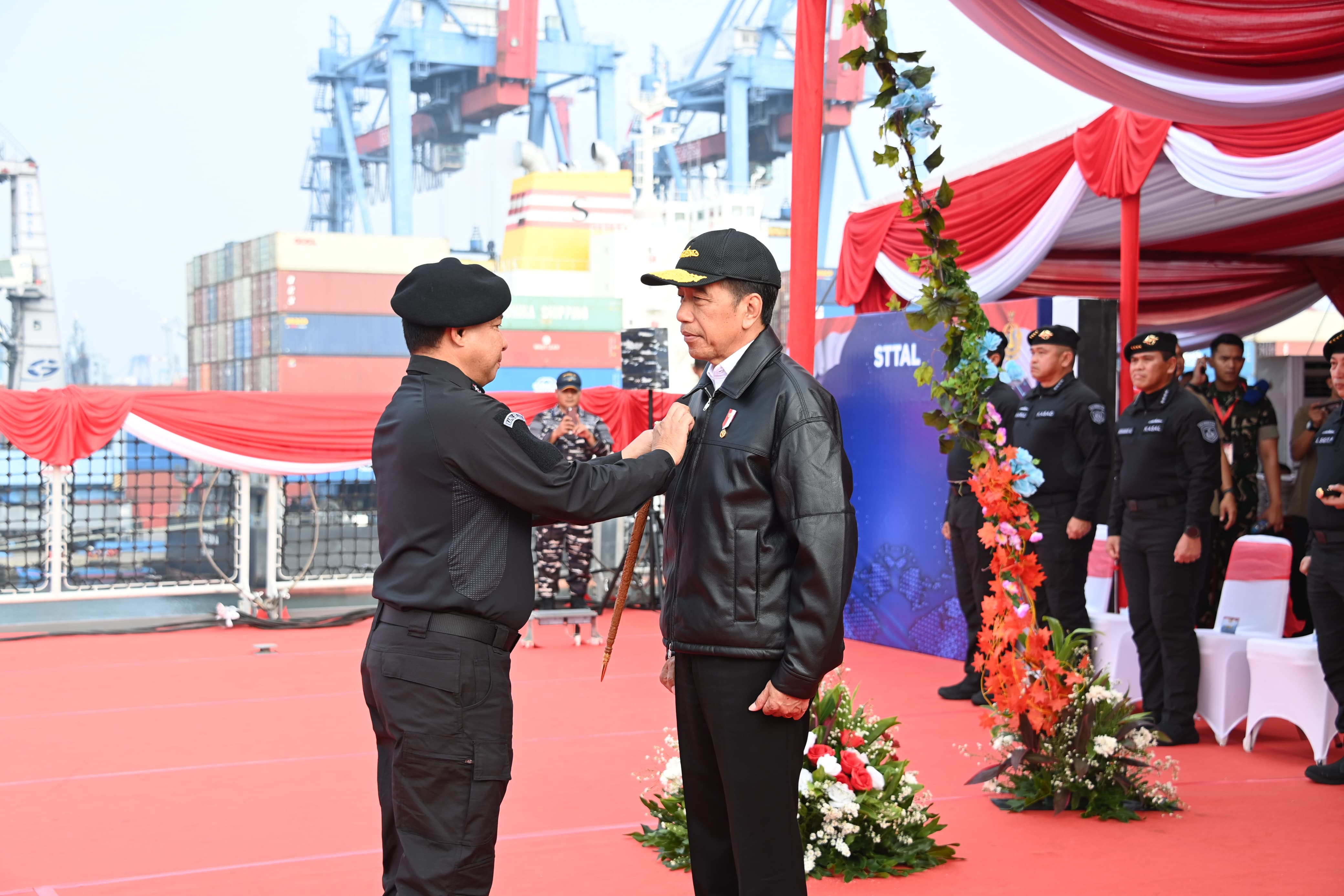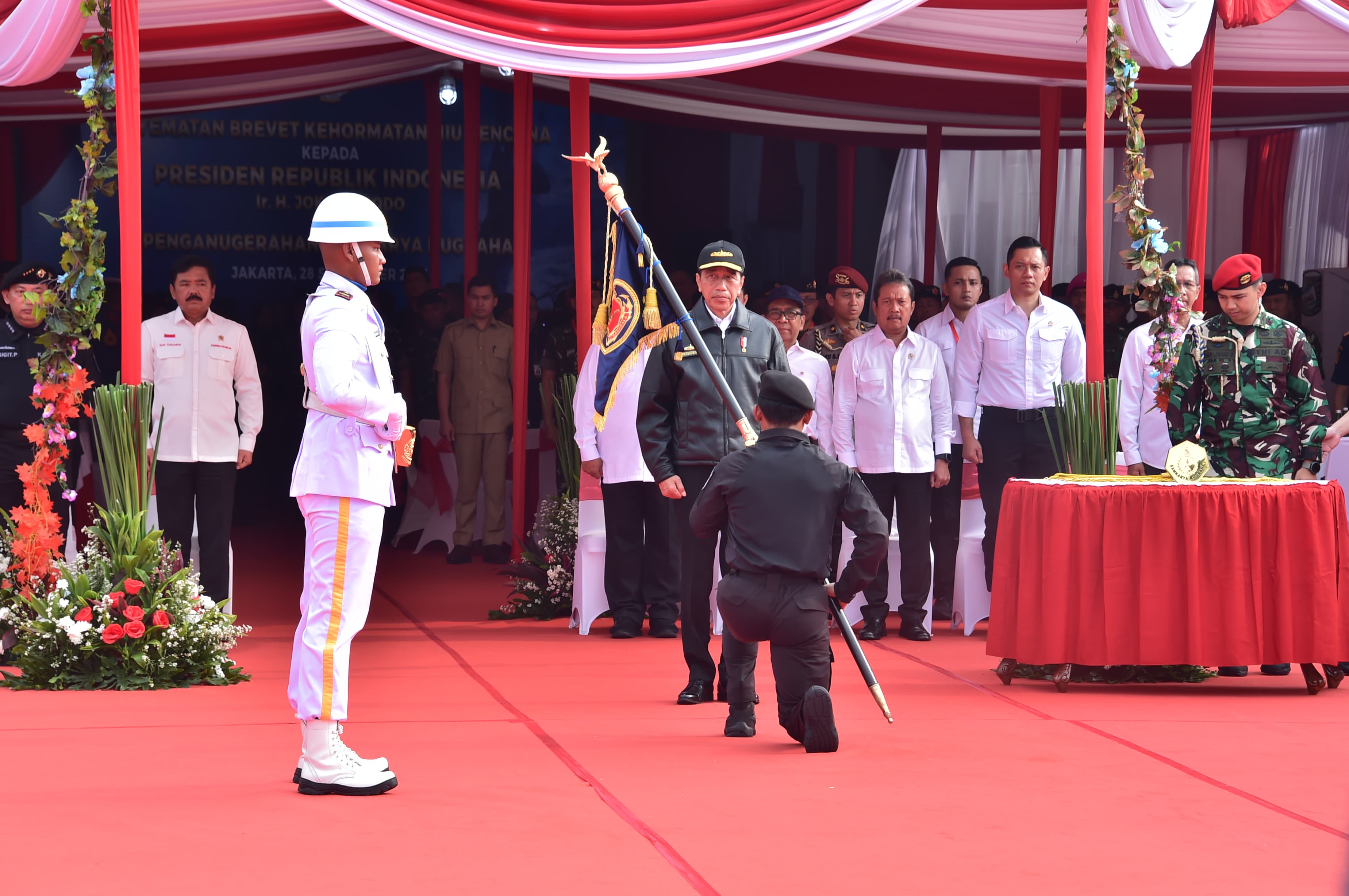 Dispen Kormar TNI Angkatan Laut (Jakarta). Komandan Korps Marinir Mayor Jenderal TNI (Mar) Dr. Endi Supardi, S.E., M.M., M.Tr.Opsla., CHRMP., CRMP., diwakili Wadan Kormar Brigjen TNI (Mar) Muhammad Nadir, M.Tr.Opsla., menyaksikan jalannya penganugerahan tanda kehormatan Samkaryanugraha dan Penyematan Brevet Kehormatan Hiu Kencana kepada Presiden Republik Indonesia (RI) Ir. H. Joko Widodo di Markas Komando Lintas Laut Militer (Kolinlamil), Jakarta Utara, Sabtu (28/09/2024).