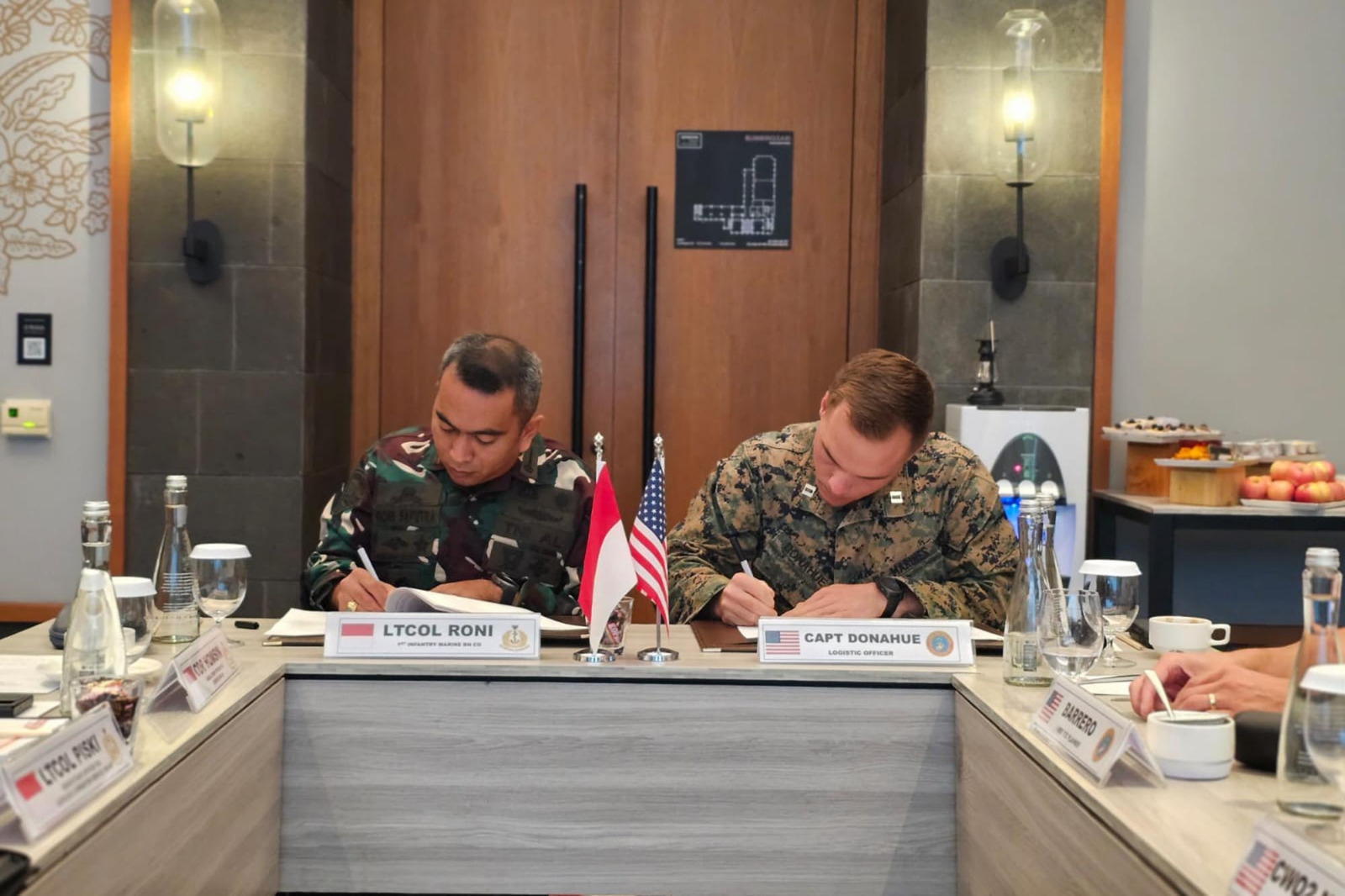 TNI AL, Dispen Kormar (Banyuwangi). Dalam rangka persiapan Latihan Bersama (Latma) Platoon Exchange TA 2024, Komandan Batalyon Infanteri 1 Marinir Letkol Marinir Roni Saputra, M.Tr.Opsla., mengikuti Final Meeting bersama U.S Marine Corps (USMC) di Hotel Kokoon Banyuwangi, Jawa Timur. Kamis (25/04/2024).