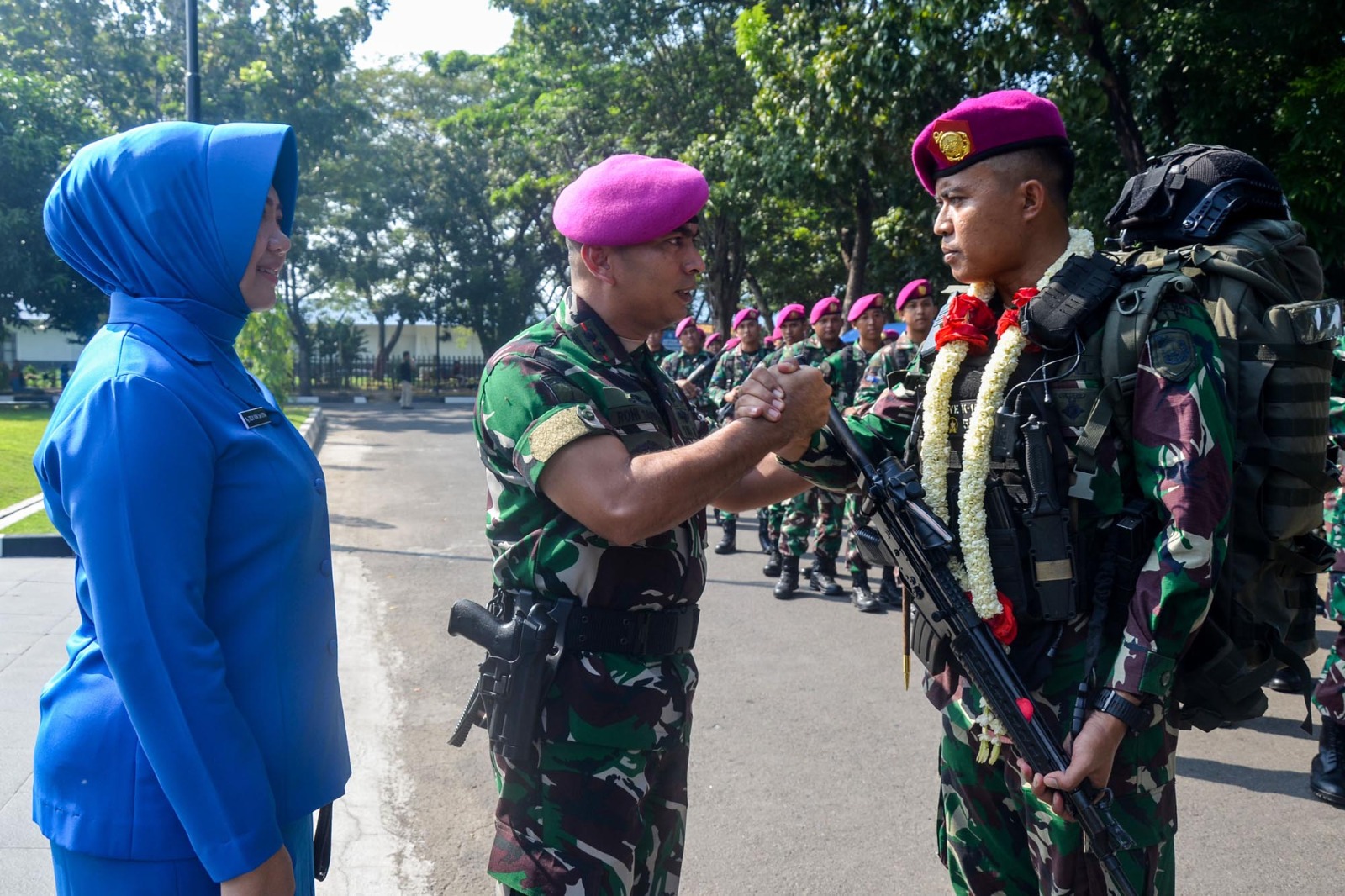 TNI AL, Dispen Kormar (Sidoarjo) Komandan Batalyon Infanteri 1 Marinir Letkol Marinir Roni Saputra, M.Tr.Opsla., didampingi Ketua Ranting B Cabang 2 Korcab Pasmar 2 Ny. Zelvi Roni Saputra menyambut personel Satgas Pamtas RI-PNG Mobile Gobang 1 Tahun Anggaran 2023 di Mayonif 1 Marinir, Gedangan, Sidoarjo, Jawa Timur. Rabu (26/06/2024)