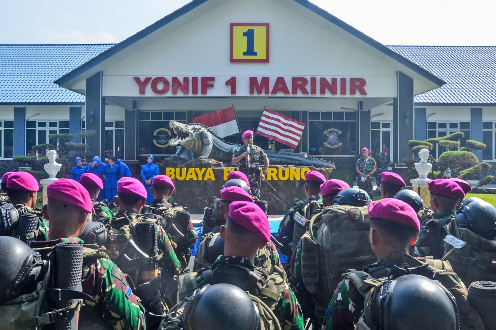 Pada upacara penyambutan tersebut, Komandan Batalyon Infanteri 1 Marinir Letkol Marinir Roni Saputra, M.Tr.Opsla., menyampaikan rasa bangga atas pencapaian yang telah diperoleh di daerah penugasan, sehingga Prajurit Batalyon Infanteri 1 Marinir mampu menjadi contoh sebagaimana prajurit Korps Marinir ketika melaksanakan satgas. Selain itu, Komandan Batalyon Infanteri 1 Marinir juga menyampaikan kepada personel satgas setelah dilaksanakan upacara penyambutan untuk mengecek kelengkapan material yang dibawa di daerah penugasan, yakinkan dengan benar tidak ada kekurangan pada material baik senjata maupun perlengkapan pribadi.