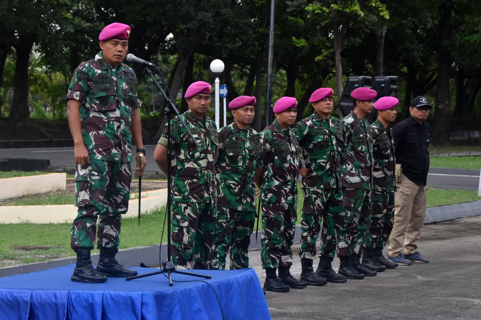 TNI AL, Dispen Kormar (Sidoarjo). Komandan Brigif 2 Marinir Kolonel Marinir Arip Supriyadi, S.H., M.M., M.Tr.Hanla memberikan arahan kepada personel Satgasmar Pam Ambalat XXIX tahun 2024 di lapangan Rencong Sakti Kesatrian Marinir R. Suhadi, Gedangan, Sidoarjo, Jawa Timur. Kamis (04/07/2024).