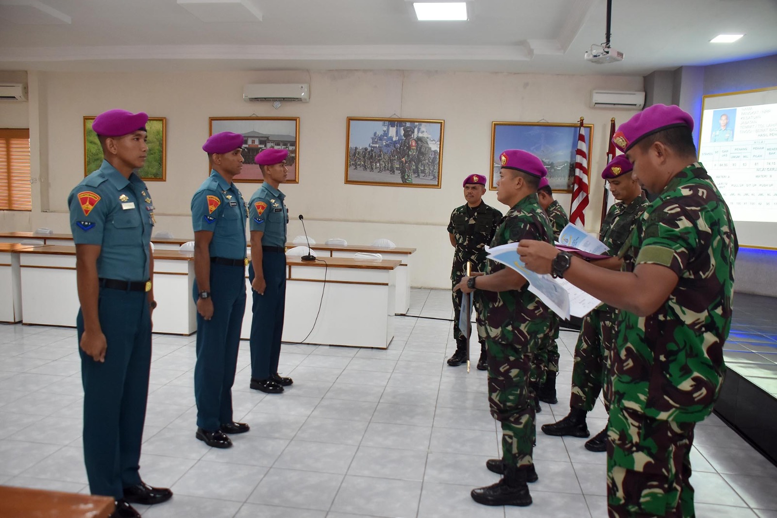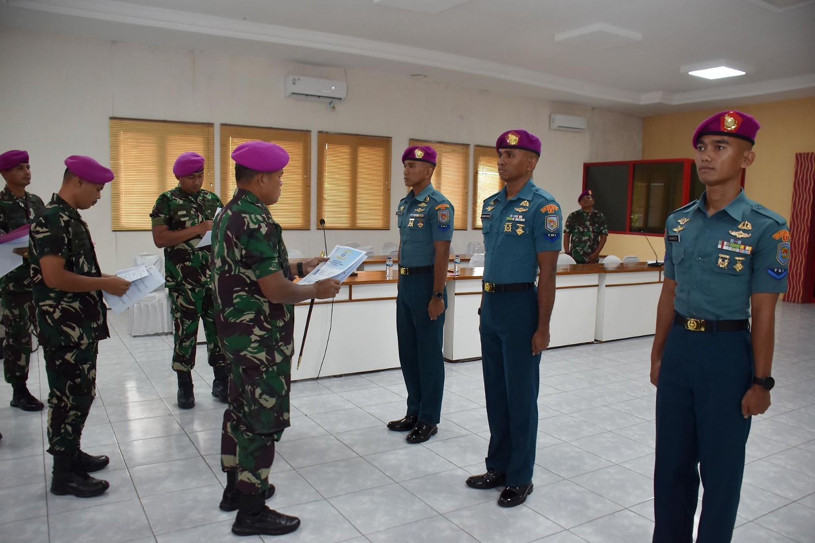 TNI AL, Dispen Kormar (Sidoarjo). Komandan Brigif 2 Marinir Kolonel Marinir Arip Supriyadi, S.H., M.M., M.Tr.Hanla melaksanakan penilaian kepada prajurit terbaiknya menjelang pelaksanaan seleksi Tamtama Teladan tahun 2024 tingkat Pasmar 2, di ruang rapat Brigif 2 Marinir Gedangan, Sidoarjo, Jawa Timur. Senin (13/05/2024).