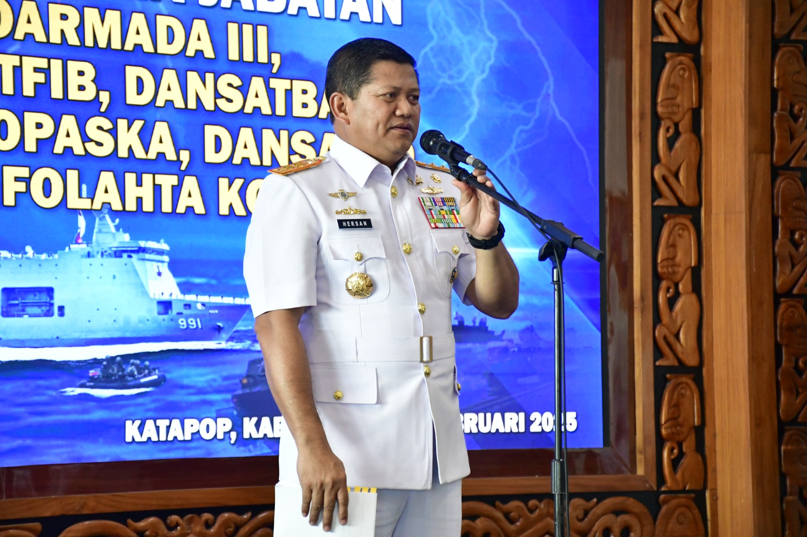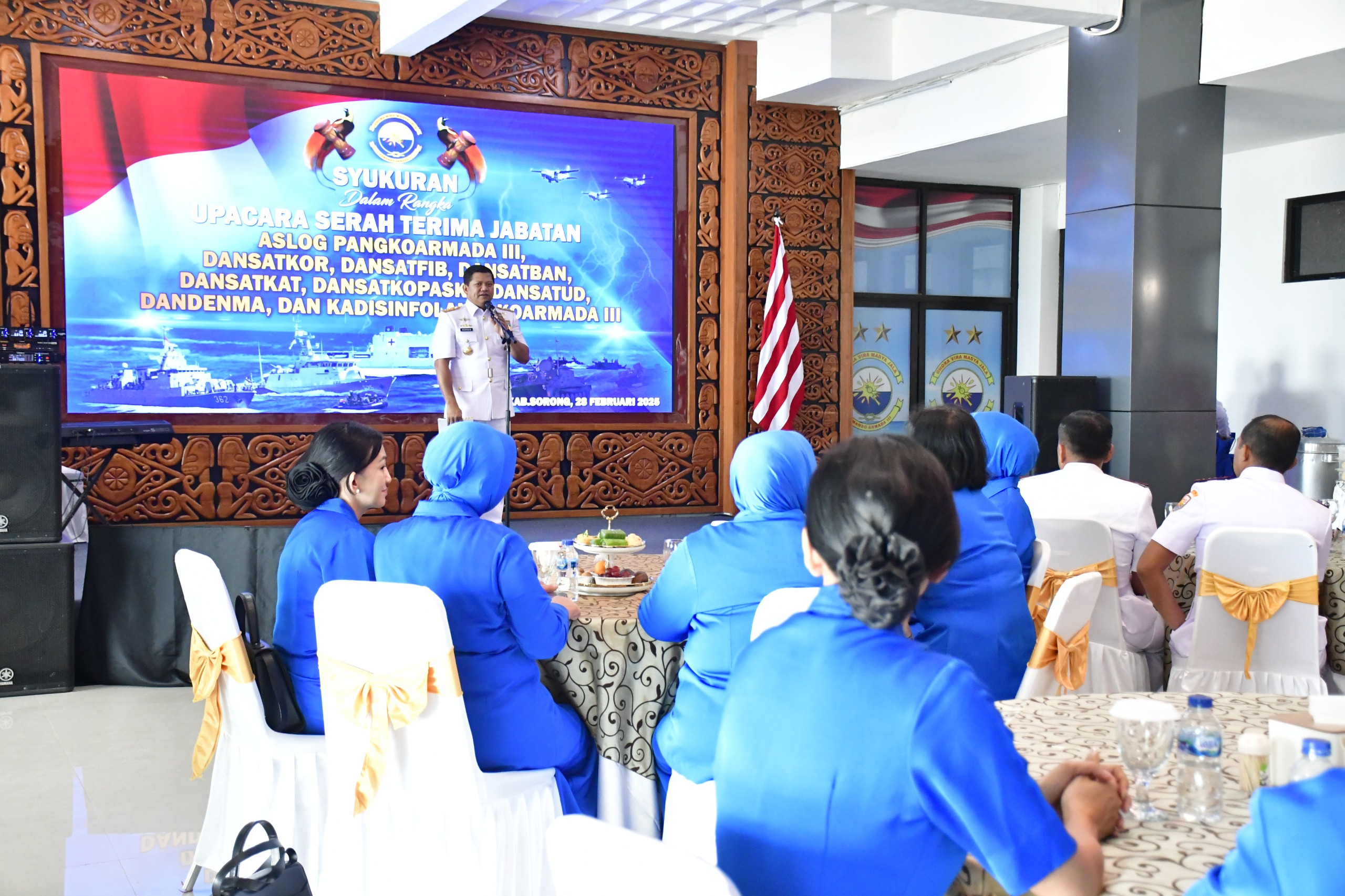 TNI AL, Dispen Kormar Sorong. Komandan Pasmar 3 Brigjen TNI (Mar) Andi Rahmat M., didampingi para Asisten Danpasmar 3 menghadiri acara Syukuran Serah Terima Jabatan (Sertijab) Pejabat Strategis di lingkungan Koarmada III bertempat di lobby Mako Koarmada III, Kel. Majener, Distrik Salawati, Kabupaten Sorong, Papua Barat Daya. Jumat (28/01/2025).