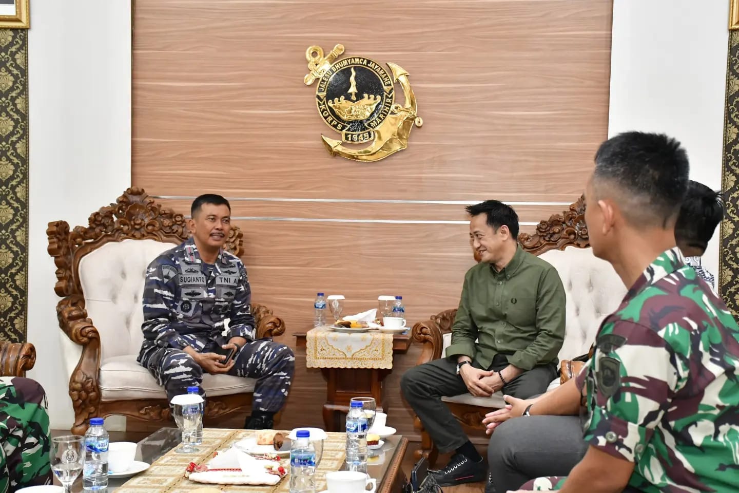 TNI AL, Dispen Kormar Sorong. Komandan Pasmar 3 Brigjen TNI (Mar) Sugianto, S. Sos., M.M., menerima kunjungan Direktur PT Tara Fazza Utama Bapak Amran Budiman di ruang VIP Mako Pasmar 3, Kesatrian Agoes Soebekti, Jl. Sorong-Klamono, Km.16, Distrik Klaurung, Kota Sorong, Papua Barat Daya. Kamis (25/04/2024).
