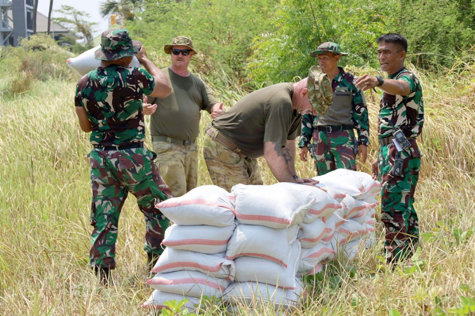 Dispen Kormar, TNI Angkatan Laut (Situbondo). Wujud kekompakan TNI dengan Prajurit Negara Sahabat, prajurit Korps Marinir Batalyon Infanteri 3 Marinir dan Australian Defence Force (ADF) bersama Masyarakat Banongan memperbaiki fillbox pertahanan sasaran Latihan Gabungan Bersama (Latgabma) Keris Woomera Tahun 2024 di Pantai Banongan, Asembagus, Situbondo, Jawa Timur. Senin (11/11/2024).