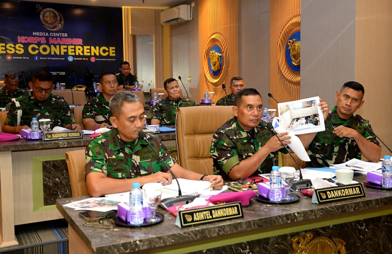 Komandan Korps Marinir (Dankormar) Mayor Jenderal TNI (Mar) Endi Supardi, S.E., M.M., M.Tr.Opsla., CHRMP., CRMP. didampingi Asintel Dankormar Kolonel Marinir Teguh Santoso, Kadispen Kormar Kolonel Marinir Bambang Dillianto, S.E., M.Tr.Hanla, Asops Dankormar Kolonel Marinir Nanang Saefullah, S.E.,M.M., Aspers Dankormar Kolonel Marinir Arif Handoyo, S.A.P., M.A.P., Kadiskes Kormar Kolonel Laut (K) Dr. Jefrrey Agung, S.N.P., Sp.Kj., M.Tr.Hanla., M.M., Sp.Kj (K), Kadiskum Kormar Kolonel Laut (Kh) Freddie Alexander Tamara, S.H., M.H. dan Kadisprov Kormar Kolonel Marinir Afin Dudun Abisantha, S.E., M.Tr.Hanla., M.M. akhirnya menggelar Press Conference bertempat di Puskodal Kormar. Jalan Prajurit KKO Usman dan Harun No 40 Kwitang Jakarta Pusat, Senin (20/05/2024). menjelasakan kejadian yang sebenarnya serta sebab musabab Lettu Laut (K) Dr. Eko Damara melakukan bundir.
