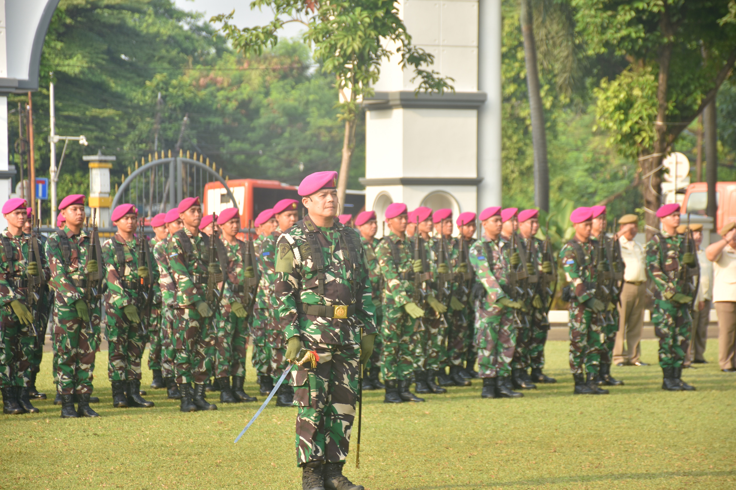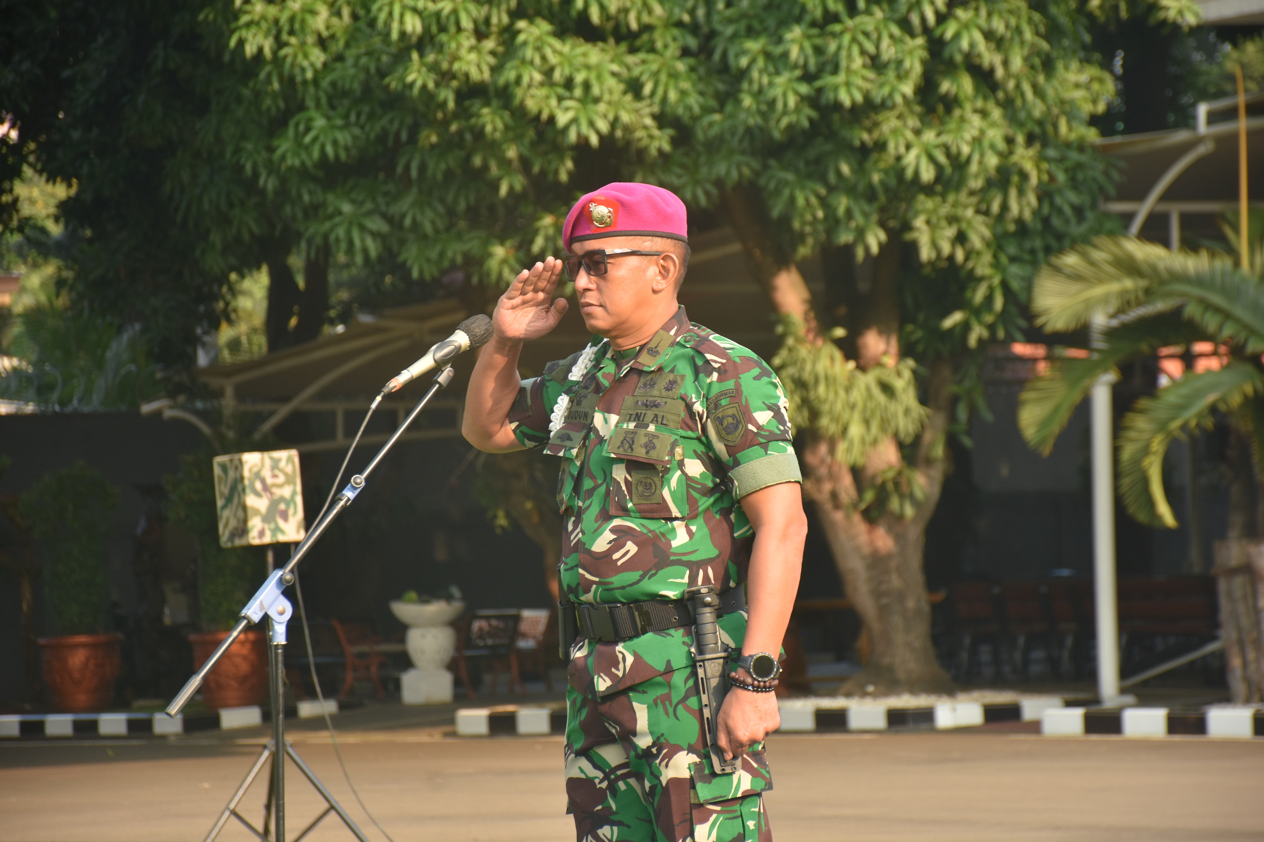 Dispen Kormar TNI Angkatan Laut (Jakarta) Kepala Dinas Provos (Kadisprov Kormar) Kolonel Marinir Afin Dudun A.,S.E., M.Tr.Hanla., M.M., bertindak selaku Inspektur Upacara pada upacara penaikkan bendera Merah Putih, di lapangan apel Mako Kormar Jl. Prajurit KKO Usman dan Harun No. 40 Kwitang Jakarta Pusat, Senin (21/07/2025).