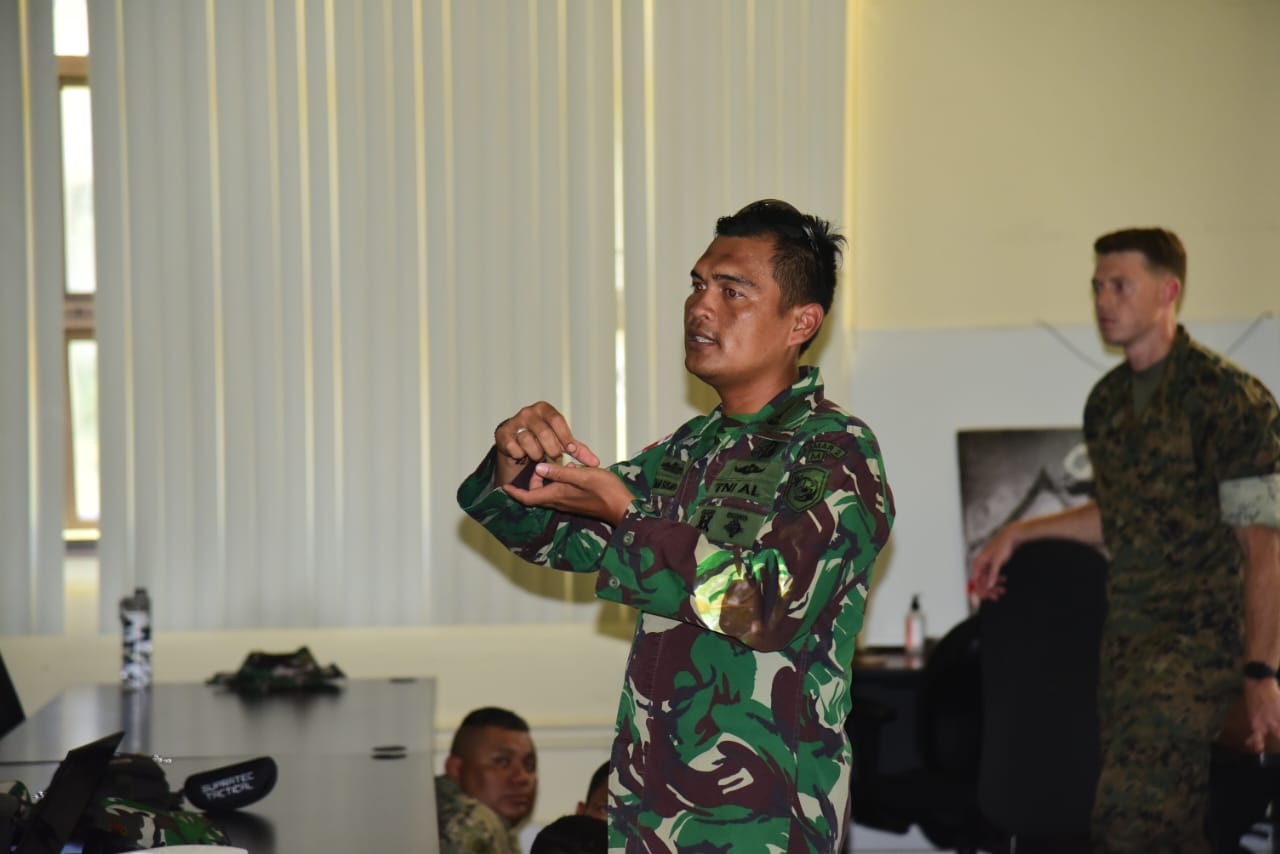 Dispen Kormar TNI Angkatan Laut (Hawaii). Prajurit Korps Marinir TNI AL memberikan materi tentang cara bertahan hidup di hutan (Jungle Survival) kepada peserta Latma Multilateral Rim of The Pacific (Rimpac) 2024, bertempat di ruang kelas US Marine, Marine Corps Base Hawaii (MCBH) Amerika Serikat, Sabtu (06/07/2024).