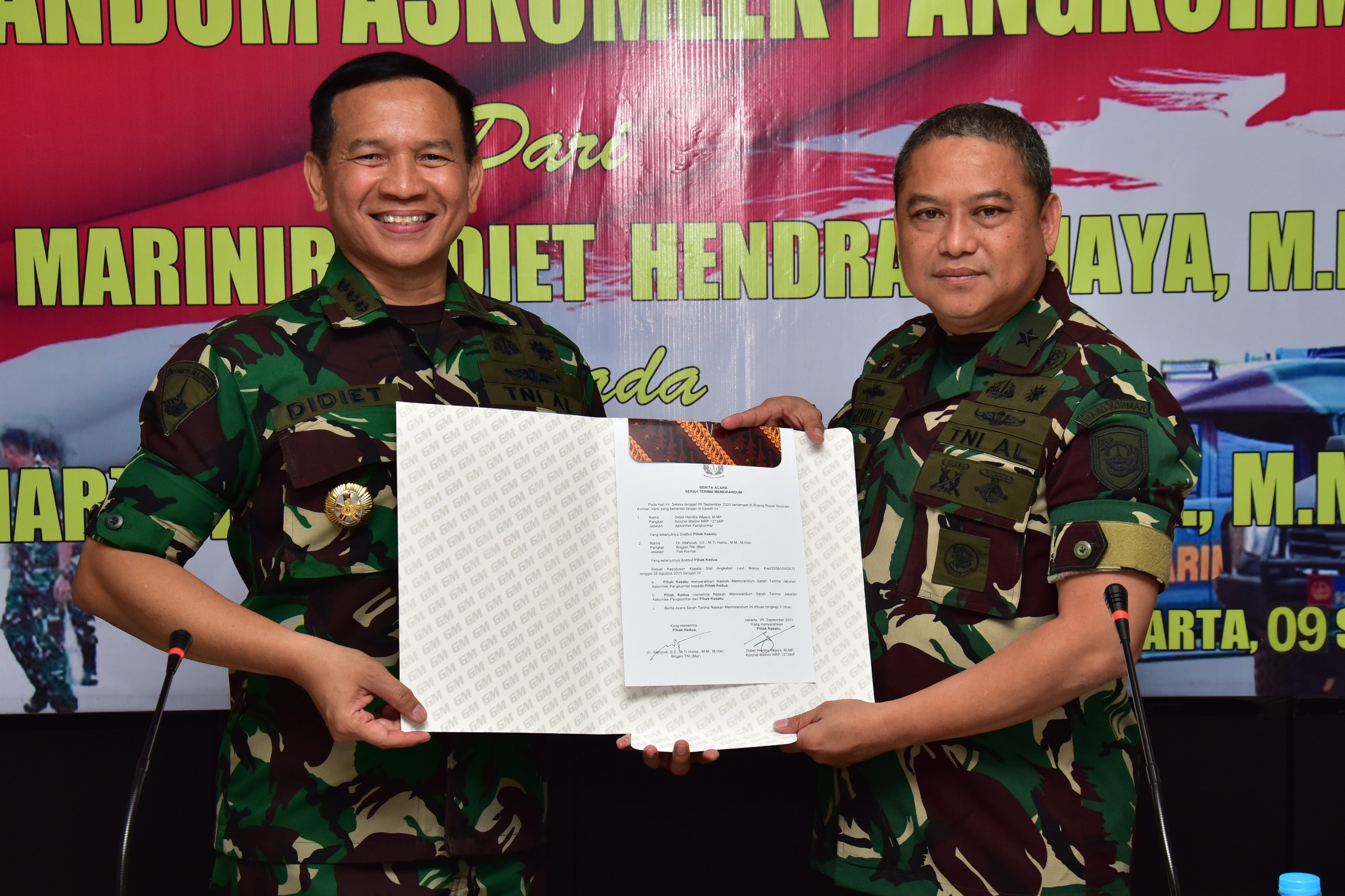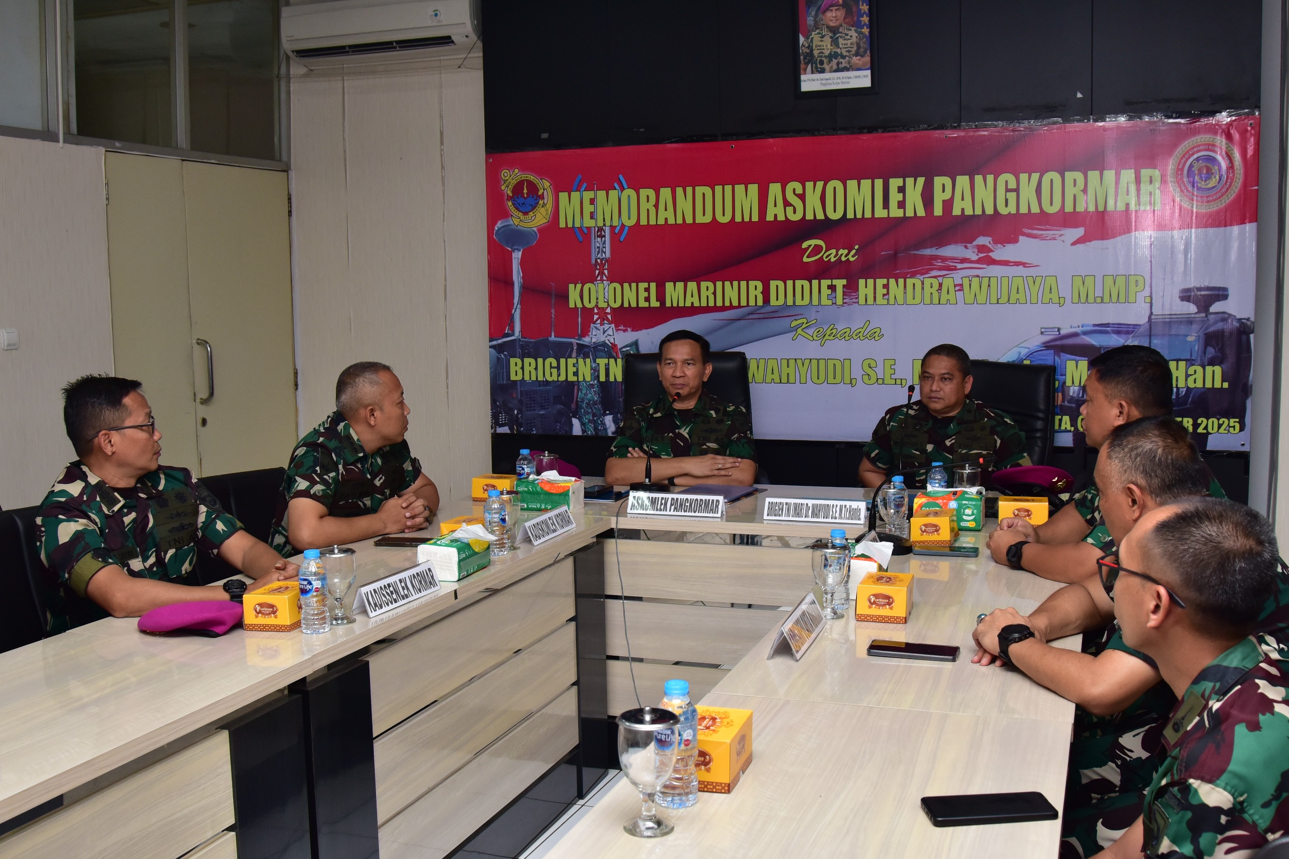 Dispen Kormar TNI Angkatan Laut (Jakarta)._ Menjelang dilaksanakannya Serah Terima Jabatan (Sertijab) Asisten Komunikasi dan Elektronika Pangkormar (Askomlek Pangkormar) dilaksanakan pembacaan memorandum oleh pejabat lama Kolonel Marinir Didiet Hendra Wijaya, M.Mp. Kepada pejabat baru Brigjen TNI (Mar) Dr. Wahyudi, S.E., M.Tr.Hanla., M.M M.Han., di ruang rapat Diskomlek Kormar, gedung Agoes Soebekti Kesatrian Marinir Ali Sadikin Mako Kormar, Jl. Prajurit KKO Usman dan Harun No.40, Jakarta Pusat, Senin (09/09/2025).