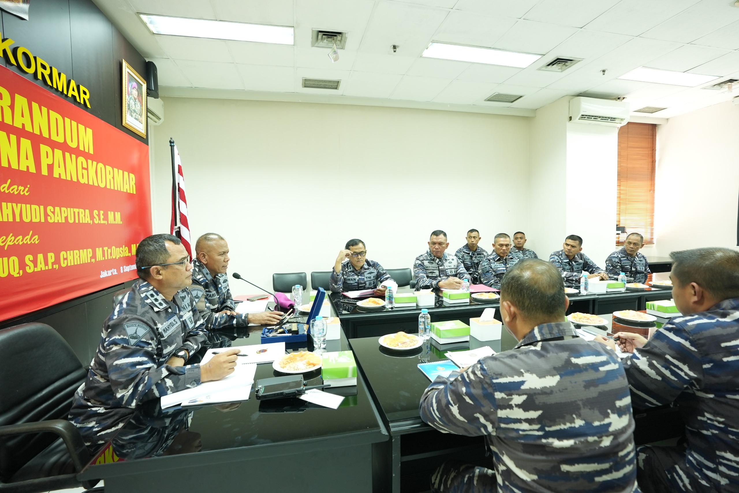 Dispen Kormar TNI Angkatan Laut (Jakarta). Menjelang dilaksanakannya Serah Terima Jabatan (Sertijab) Asisten Perencanaan dan Anggaran Panglima Korps Marinir (Asrena Pangkormar), dilaksanakan pembacaan memorandum oleh pejabat lama Kolonel Marinir Wahyudi Saputra, S. E., M.M. kepada pejabat baru Brigjen TNI (Mar) Umar Farouq, S.A.P., CHRMP., M.Tr.Opsla., M.Han., di ruang rapat Srena Kormar, gedung Agoes Soebekti Kesatrian Marinir Ali Sadikin Mako Kormar, Jl. Prajurit KKO Usman dan Harun No.40, Jakarta Pusat, Senin (08/09/2025).
