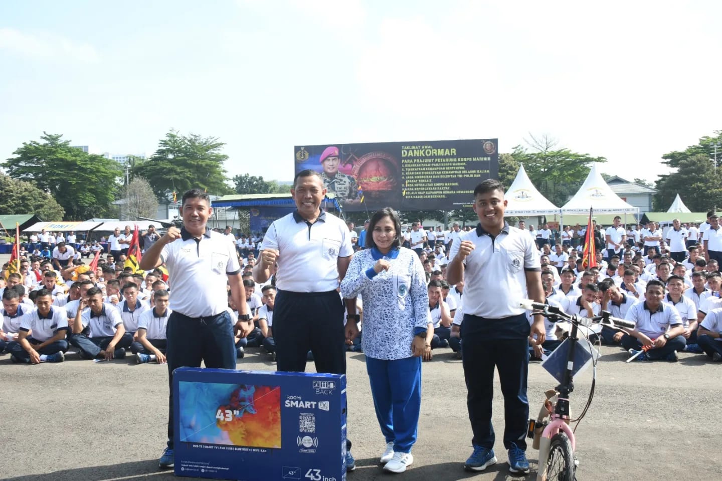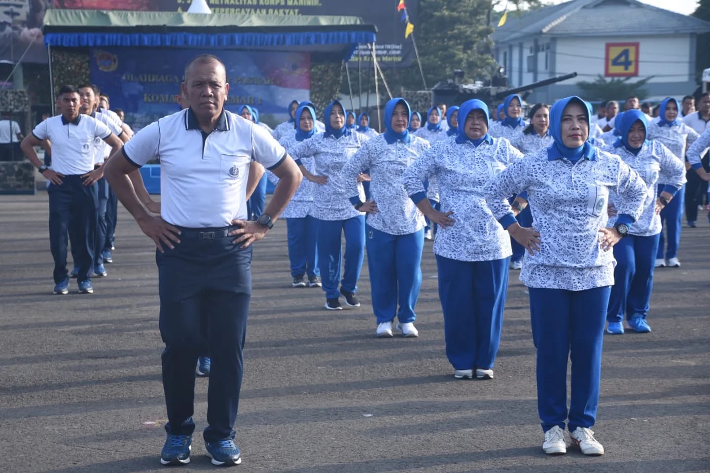 TNI AL, Dispen Kormar (Jakarta), Pasmar 1. Komandan Pasmar 1 (Danpasmar 1) Brigjen TNI (Mar) Umar Farouq, S.A.P., CHRMP., M.Tr.Opsla., M.Han., beserta Ketua Korcab Pasmar 1 Ny. Atik Umar Farouq memimpin olahraga bersama dan pemberian penghargaan kepada Satuan, prajurit dan Jalasenastri Pasmar 1 yang berprestasi, bertempat di lapangan Apel Brigif 1 Marinir, Kesatrian Marinir Hartono, Cilandak, Jakarta Selatan, Jumat (26/04/2024).