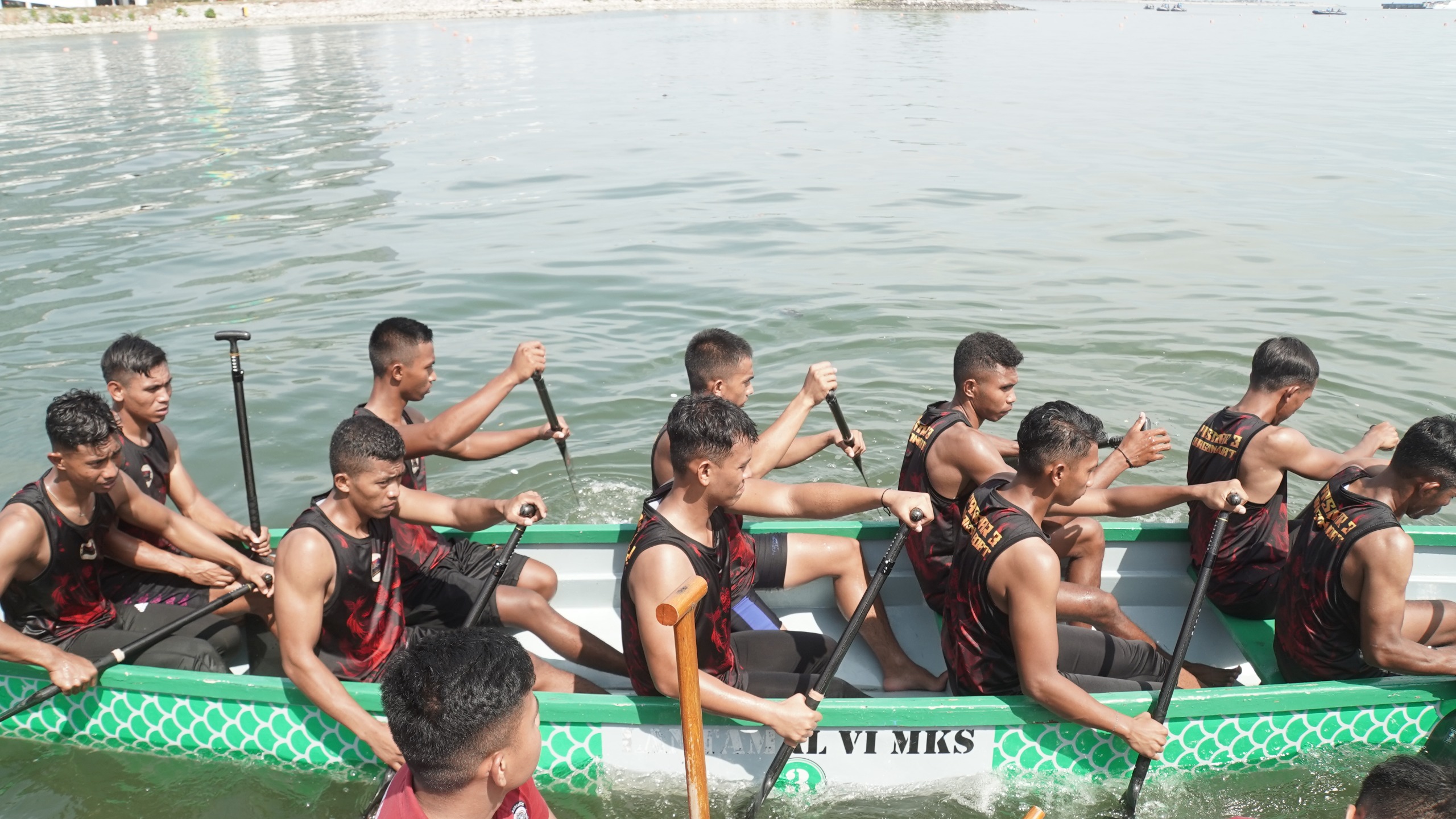 Di tengah ombak Pantai Losari yang menantang dan hembusan angin laut yang kencang, para prajurit Marinir Pasmar 3 menunjukkan performa terbaiknya dengan dayungan kompak, ritme terukur, serta semangat juang tinggi hingga garis finis.