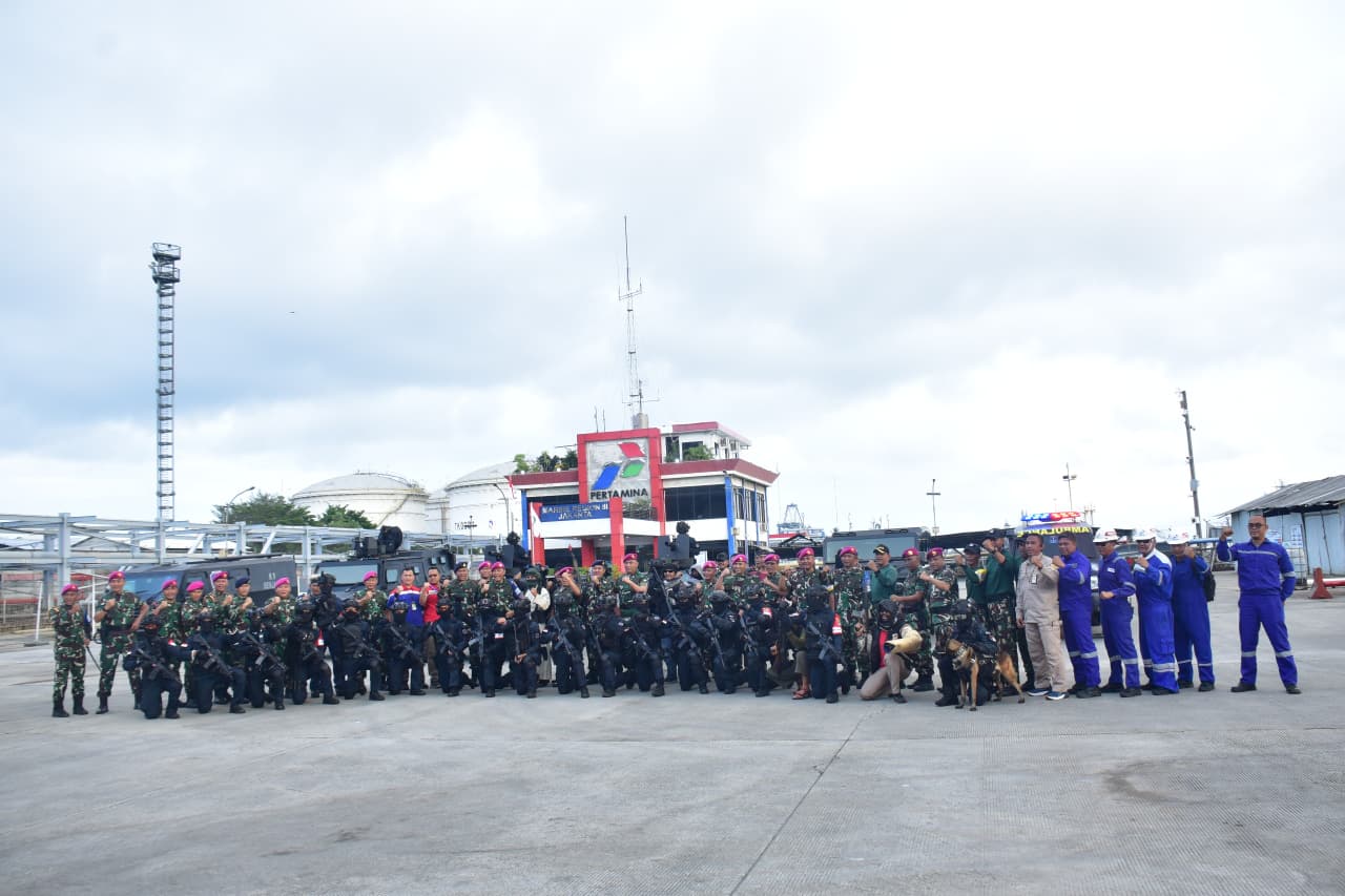 Komandan Komando Latih Korps Marinir (Dankolatmar) Brigjen TNI (Mar) Agus Dwi Laksana Putra, mewakili Panglima Korps Marinir Marinir (Pangkormar) Letnan Jenderal TNI (Mar) Dr. Endi Supardi, S.E., M.M., M.Tr.Opsla., CHRMP., CRMP., memimpin peninjauan Latihan Anti Teror Denjaka Tahun 2025 di PT. Pertamina Marine Region III Jakarta Tanjung Priok, Koja, Jakarta Utara, Rabu (10/12/2025).