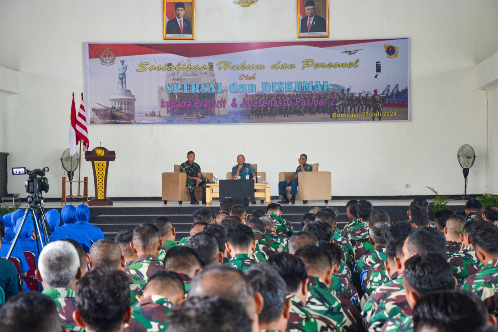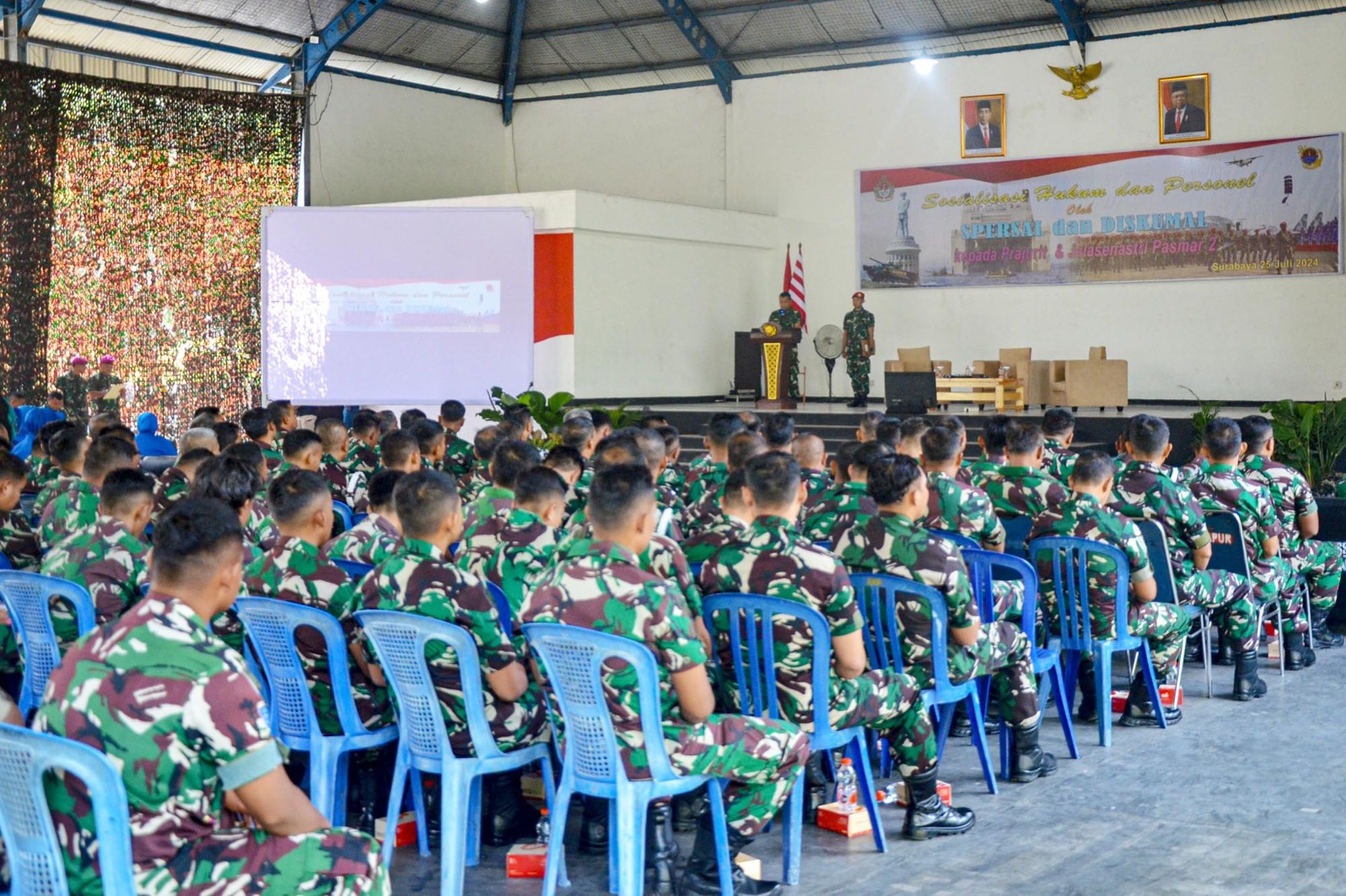 TNI AL Dispen Kormar (Surabaya) Komandan Batalyon Infanteri 1 Marinir Letkol Marinir Roni Saputra, M.Tr.Opsla beserta Prajurit dan Jalasenastri menerima penyuluhan sosialisai Hukum dan Personel dari Markas Besar TNI Angkatan Laut bertempat di Indoor Sport Karangpilang, Surabaya, Jawa Timur. Kamis (25/07/2024).
