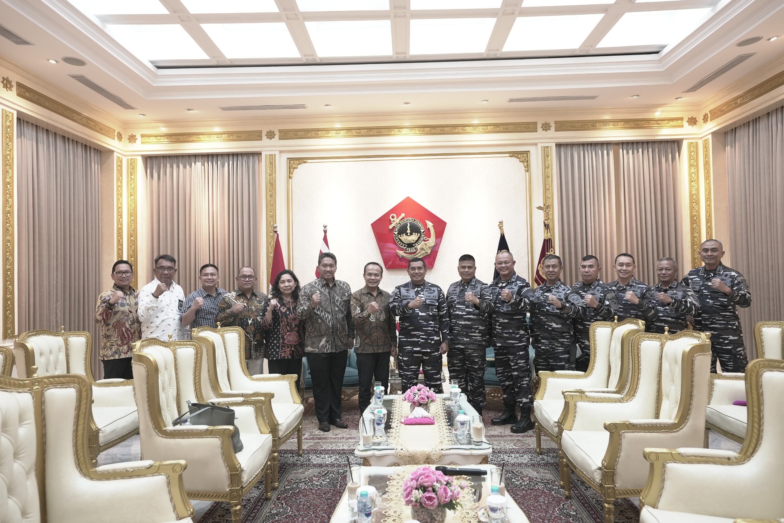 Dispen Kormar TNI Angkatan Laut (Jakarta). Panglima Korps Marinir (Pangkormar) Letnan Jenderal TNI (Mar) Dr. Endi Supardi, S.E., M.M., M.Tr.Opsla., CHRMP., CRMP., menerima kunjungan kerja Sekretaris Kementrian Koordinator Bidang Perekonomian (Sesmenko Perekonomian) Bapak Susiwijono Moegiarso, S.E., M.E., beserta staf dan delegasi perwakilan badan dan kementerian di Admiral Room Gedung Utama Mako Kormar, Jakarta Pusat, pada Kamis (04/09/2025).