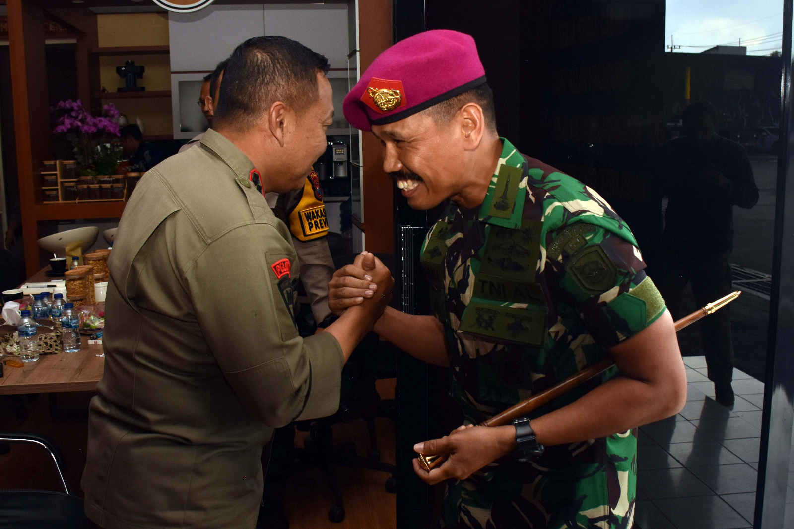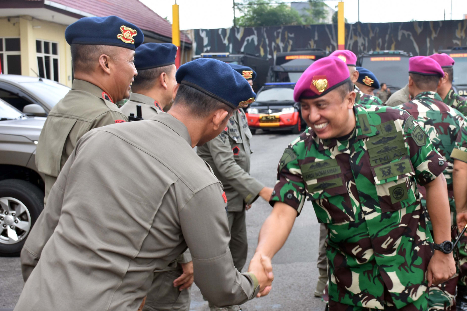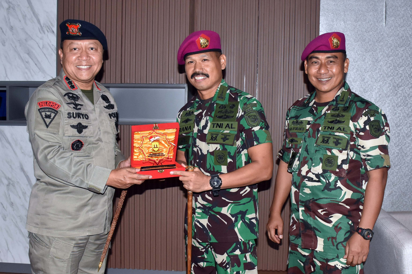 TNI AL. Dispen Kormar (Surabaya). Dalam rangka untuk menjaga sinergitas dan soliditas TNI Polri, Komandan Menart 2 Marinir Kolonel Marinir Rana Karyana, S.E.,M.Tr.Hanla.,M.M.,CRHMP bersama Perwira Staf mengunjungi Mako Brimob Polda Jatim di Jl Bhayangkara No 74, Taman â Sidoarjo. Rabu (24/04/2024).