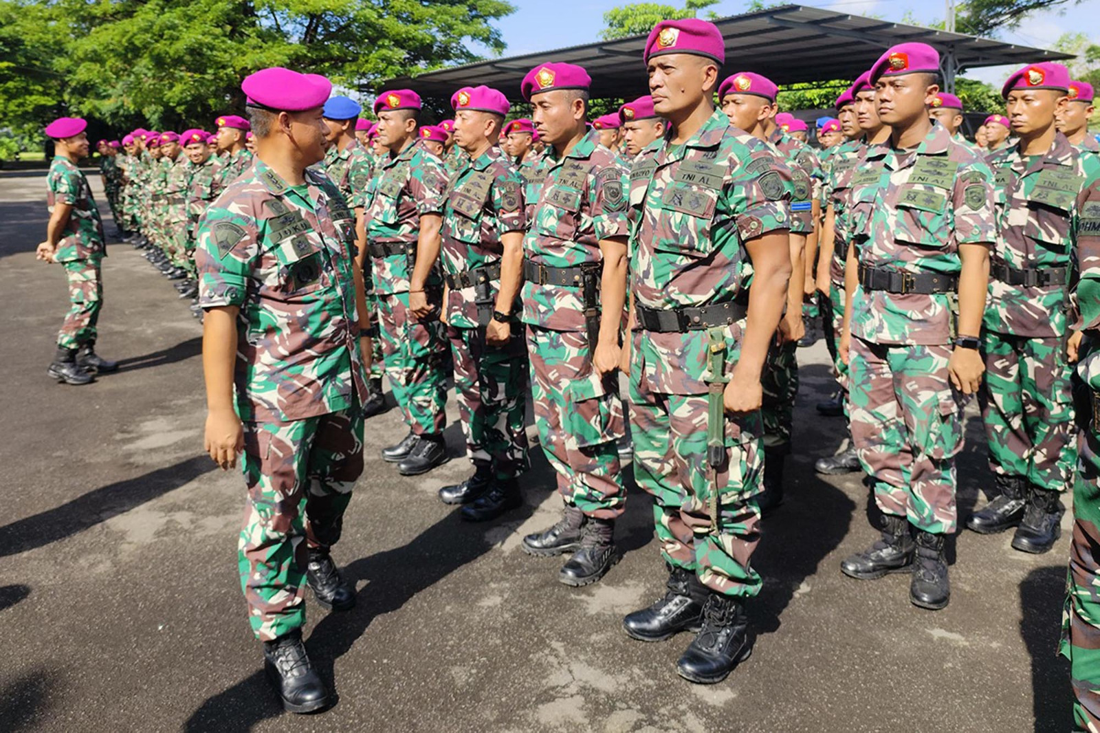 TNI AL, Dispen Kormar (Sidoarjo) Prajurit Batalyon Infanteri 1 Marinir melaksanakan pengecekan personel oleh Asops Danpasmar 2 Kolonel Marinir Joko Fitrianto dalam rangka persiapan Satgas Puter XXVIII dan Satgas Ambalat XXX di Mako Pasmar 2 Kesatrian Marinir Moekijat, Gedangan, Sidoarjo, Jawa Timur. Jumat (26/04/2024).
