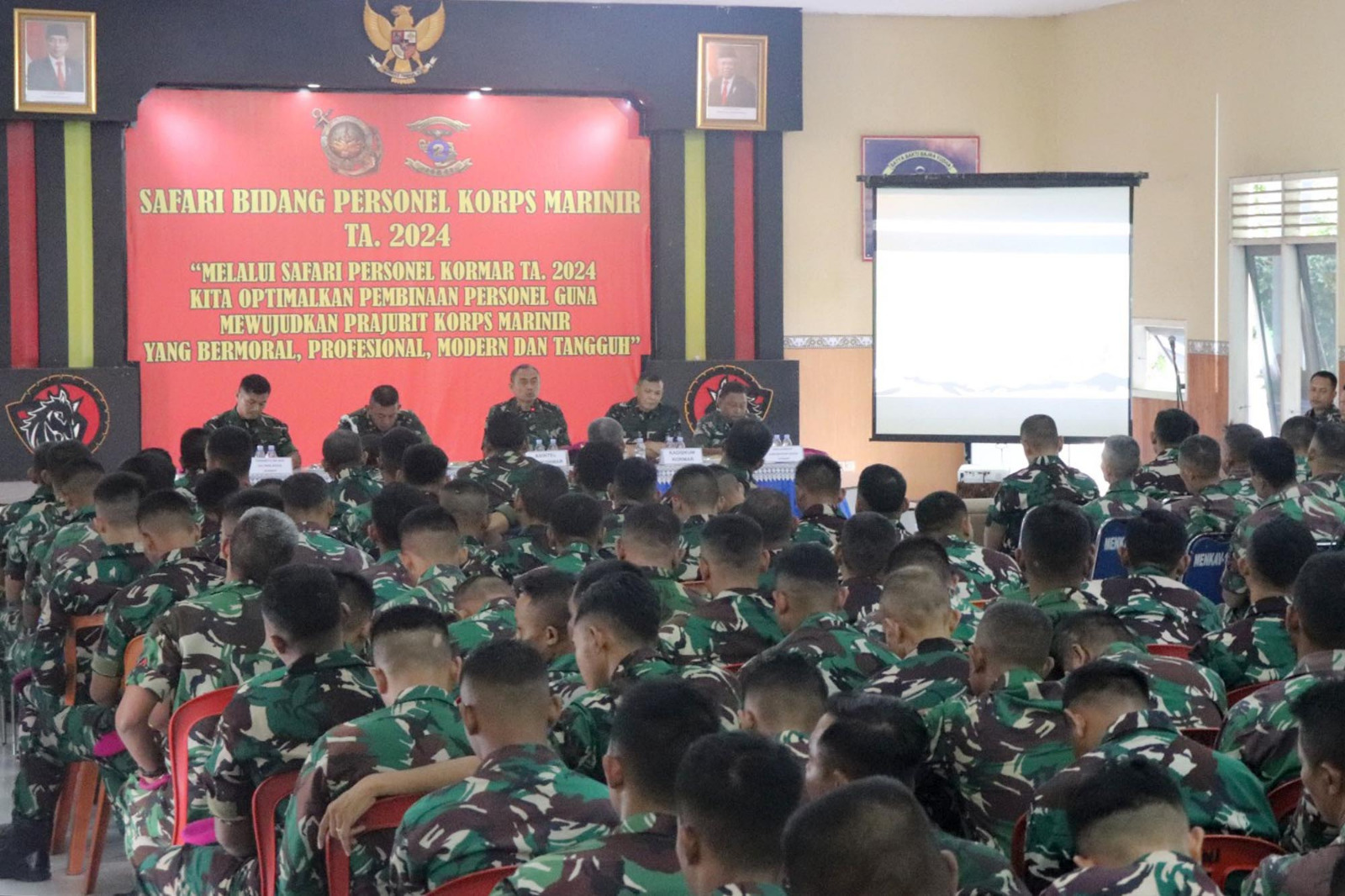 TNI AL, Dispen Kormar (Surabaya). Prajurit Batalyon Infanteri 5 Marinir mengikuti kegiatan Safari Bidang Personel Korps Marinir TA.2024 yang disampaikan langsung oleh Asintel Dankormar Kolonel Marinir Teguh Santoso di Balai Prajurit Yonranratfib 2 Marinir Semarung, Ujung, Surabaya, Jawa Timur. Rabu (24/04/2024).