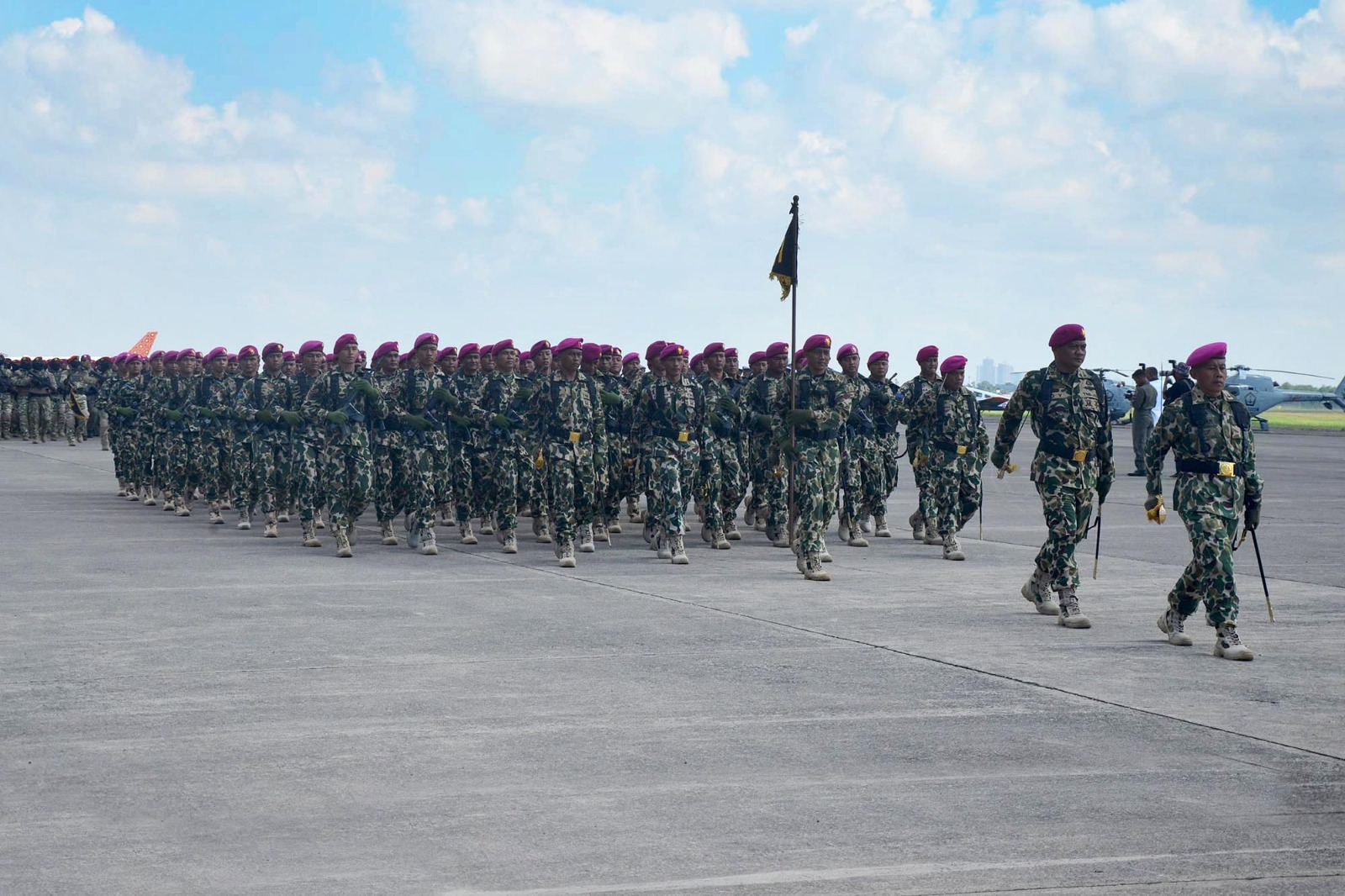 Dispen Kormar, TNI AL (Sidoarjo). Prajurit Brigif 2 Marinir dibawah pimpinan Mayor Marinir Kemiran terlibat dalam upacara parade dan Defile peringatan HUT Ke-68 Penerbangan TNI Angkatan Laut di Apron Hanggar Pangkalan Udara Angkatan Laut Juanda, Sidoarjo. Kamis (27/06/2024).