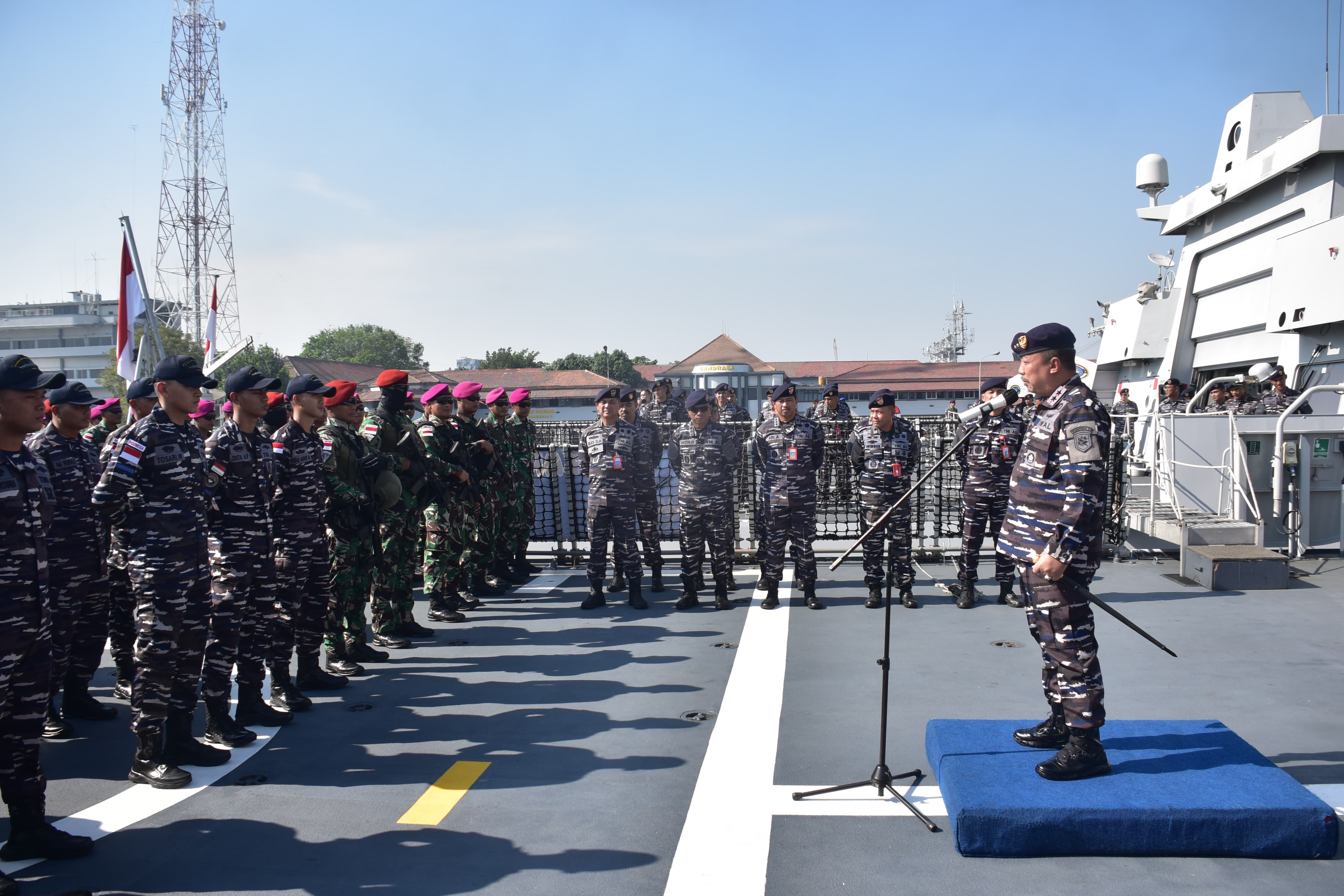 Dispen Kormar TNI Angkatan Laut (Surabaya). Prajurit Korps Marinir TNI Angkatan Laut yang tergabung dalam Satgas Multilateral Rim of The Pacific (Rimpac) 2024, ikuti penyambutan kedatangan KRI Raden Eddy Martadinata-331 yang telah kembali ke Indonesia berlayar melewati Samudra Pasifik selesai melaksanakan Latma Multilateral Rimpac 2024 Hawaii.