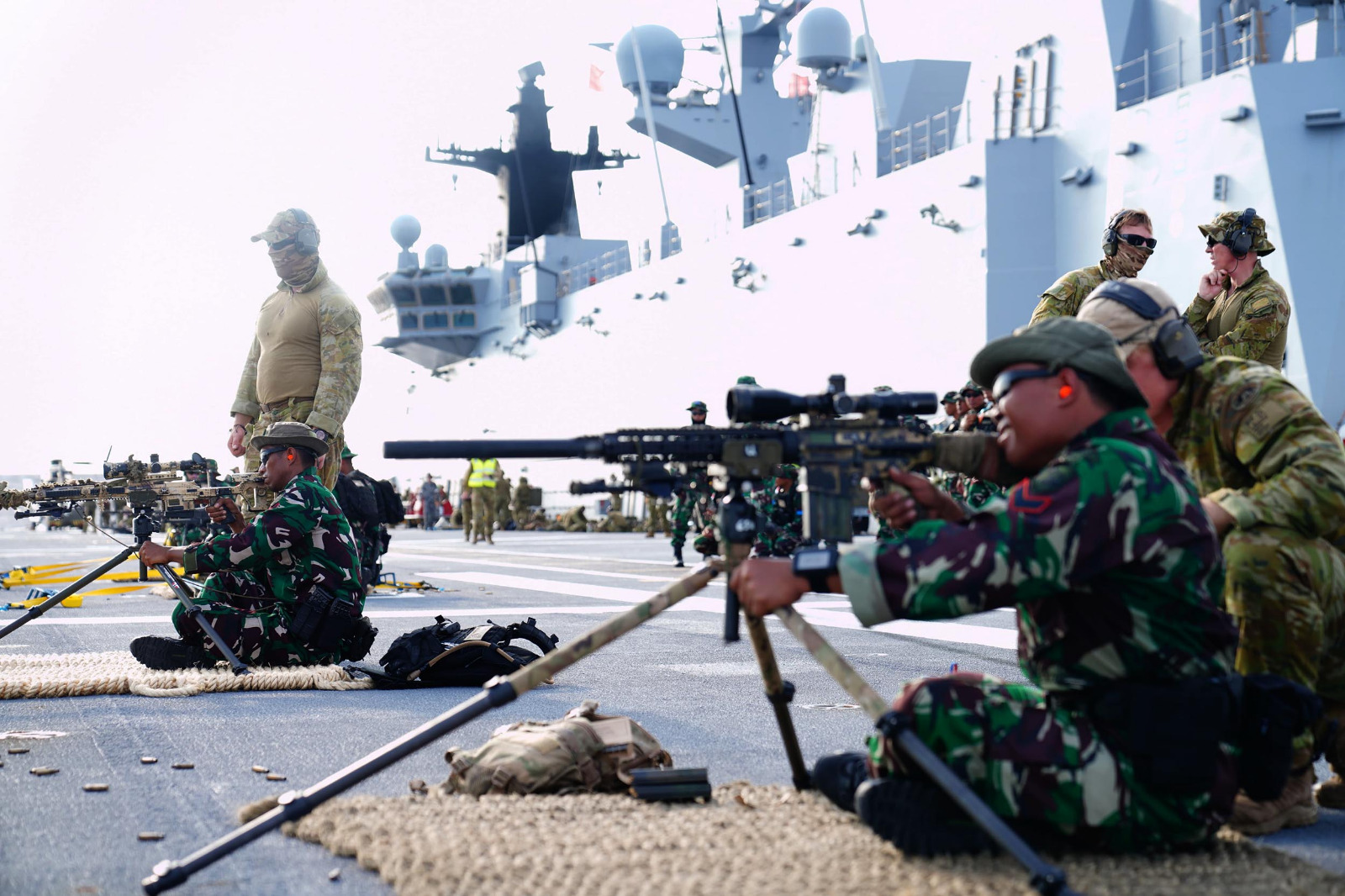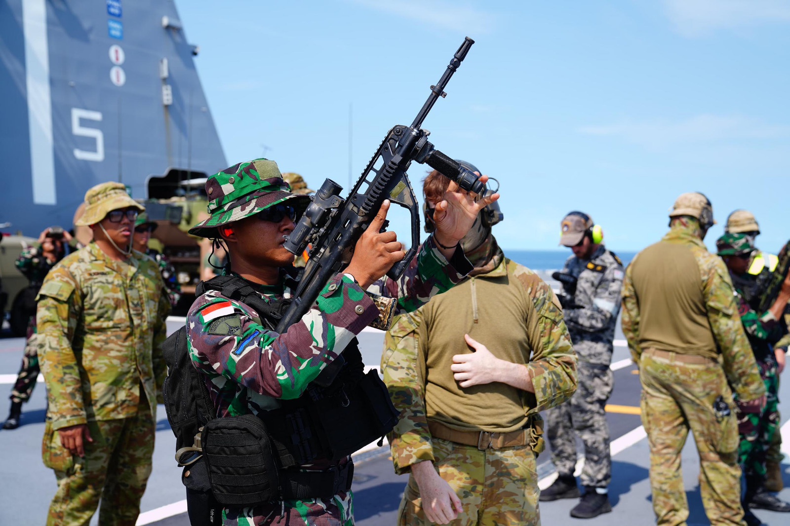 Dispen Kormar, TNI Angkatan Laut (Australia). Prajurit Batalyon Infanteri 3 Marinir melaksanakan Latihan menembak bersama Australian Defence Force (ADF) dengan materi Marksmanship dan Sniper yang dilaksanakan di atas Kapal, HMAS ADELAIDE di perairan Pulau Bathurst, Australia. Kamis (07/11/2024).
