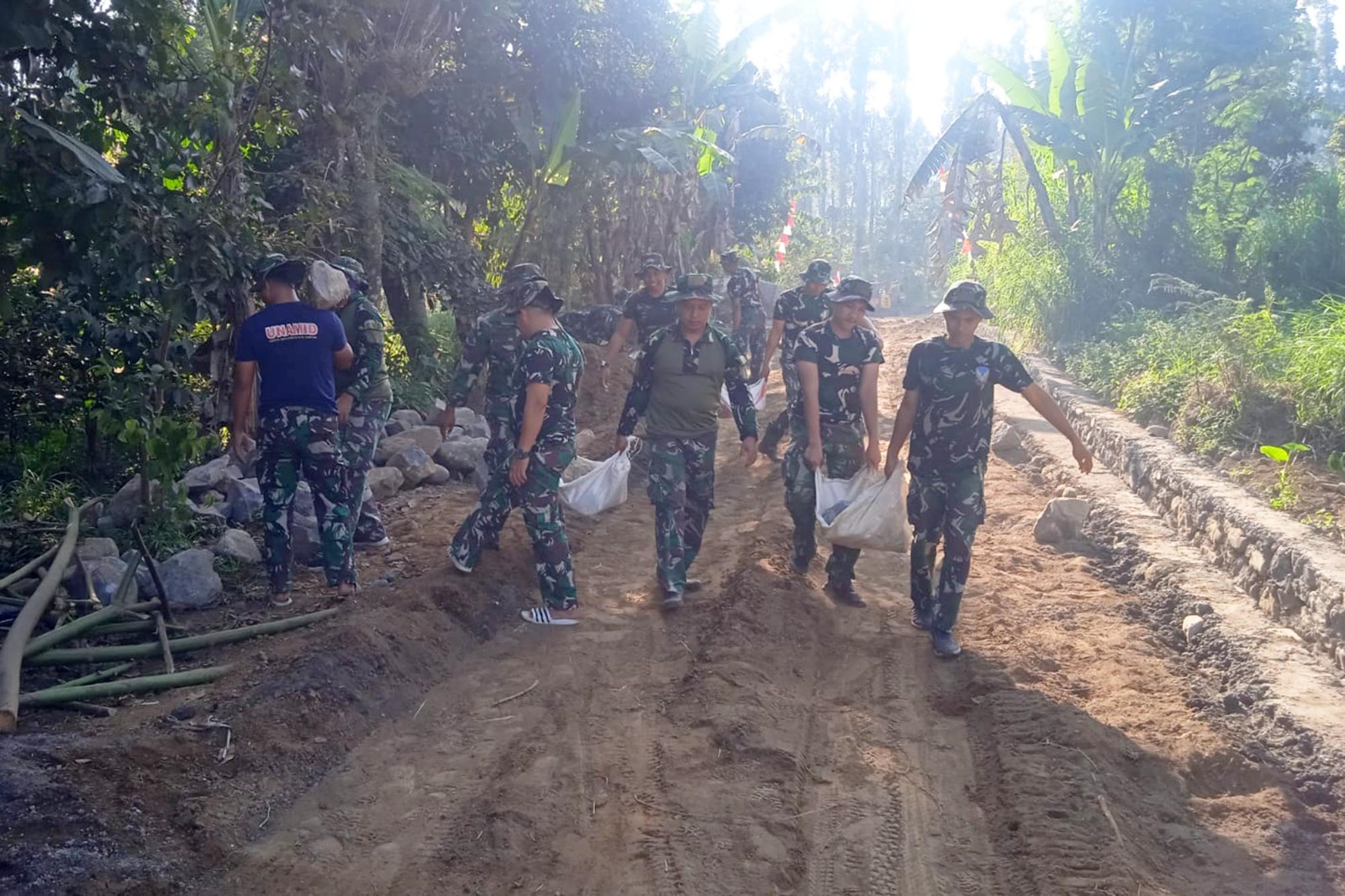 TNI AL, Dispen Kormar (Probolinggo). Prajurit Batalyon Infanteri 5 Marinir yang tergabung dalam program TNI Manunggal Membangun Desa (TMMD) ke-121 TA. 2024 di Bawah Kendali Operasi (BKO) Kodim 0820 Probolinggo melaksanakan perbaikan akses jalan dan pembangunan drainase di Dusun Cocok, Desa Kalianan, Krucil, Probolinggo, Jawa Timur. Kamis (25/07/2024).