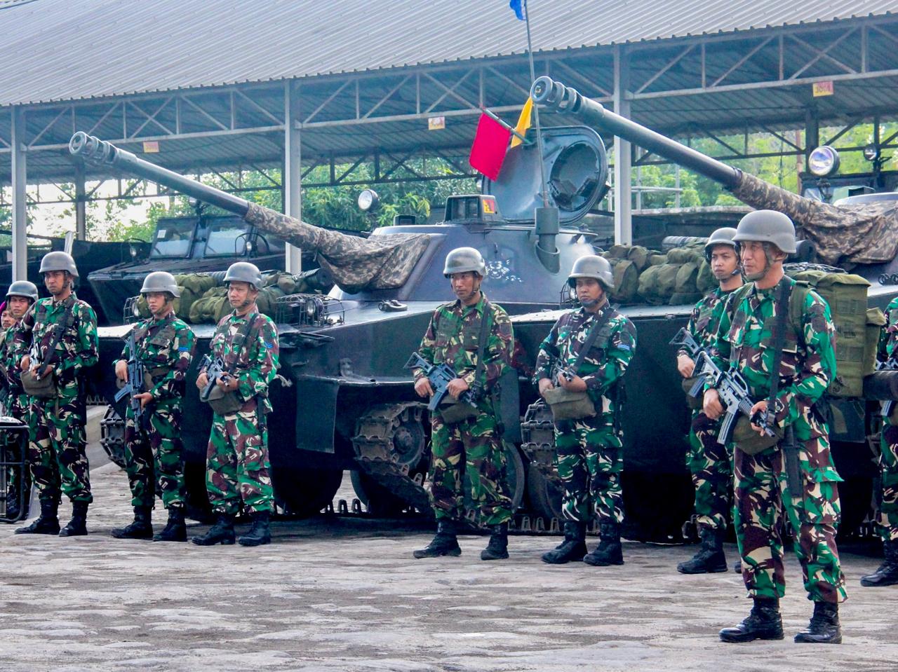 TNI AL .Dispen Kormar (Surabaya). Dalam rangka mempersiapkan Satgas Trisila â 24 TA 2024, prajurit Batalyon Tank Amfibi 2 Marinir mengikuti apel gelar kesiapan personil dan Kendaraan Tempur (Ranpur) di Mako Menkav 2 Mar Kesatrian Marinir Soepraptono Semarung, Ujung Surabaya. Jumat (28/06/2024).
