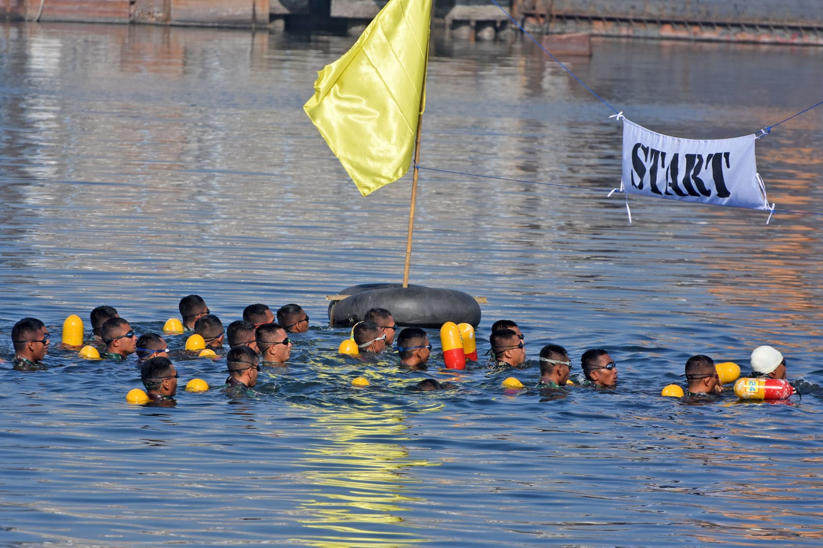 Dispen Kormar TNI Angkatan Laut (Surabaya). 17 Tim/Batalyon Peserta binsat Kormar bertarung materi Renang Laut 1000 meter yang dilaksanakan di Dermaga Kapal Selam Koarmada II, Ujung, Semampir, Surabaya. Rabu (30/10/2024).