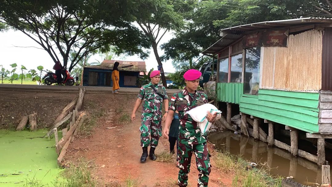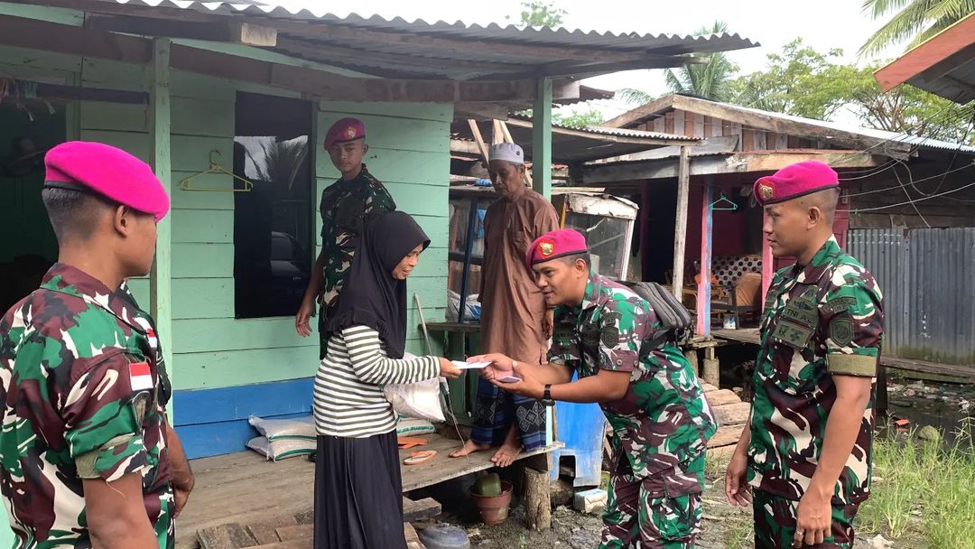 TNI AL Dispen Kormar (Sorong). Guna menyempurnakan ibadah di bulan Ramadhan prajurit Resimen Artileri 3 Marinir salurkan zakat fitrah dan sembako kepada masyarakat sekitar Kesatrian Marinir Katapop Abraham Octavianus Atururi, Kec. Salawati, Kab. Sorong, Papua Barat Daya. Selasa (09/04/2024).