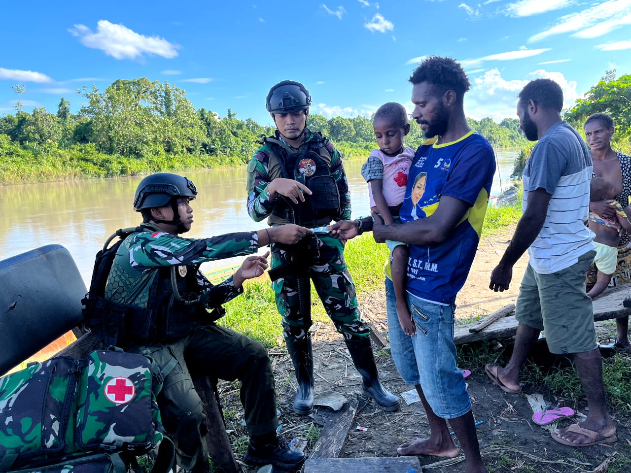 Dispen Kormar, TNI Angkatan (Yahukimo Papua). Prajurit Satgas Pamtas Mobile Yonif 7/Gobang Marinir, Koops Habema, dibawah pimpinan Lettu Laut (K) dr. Eko Dhamara, melaksanakan kegiatan bhakti sosial di daerah Distrik Dekai Papua.