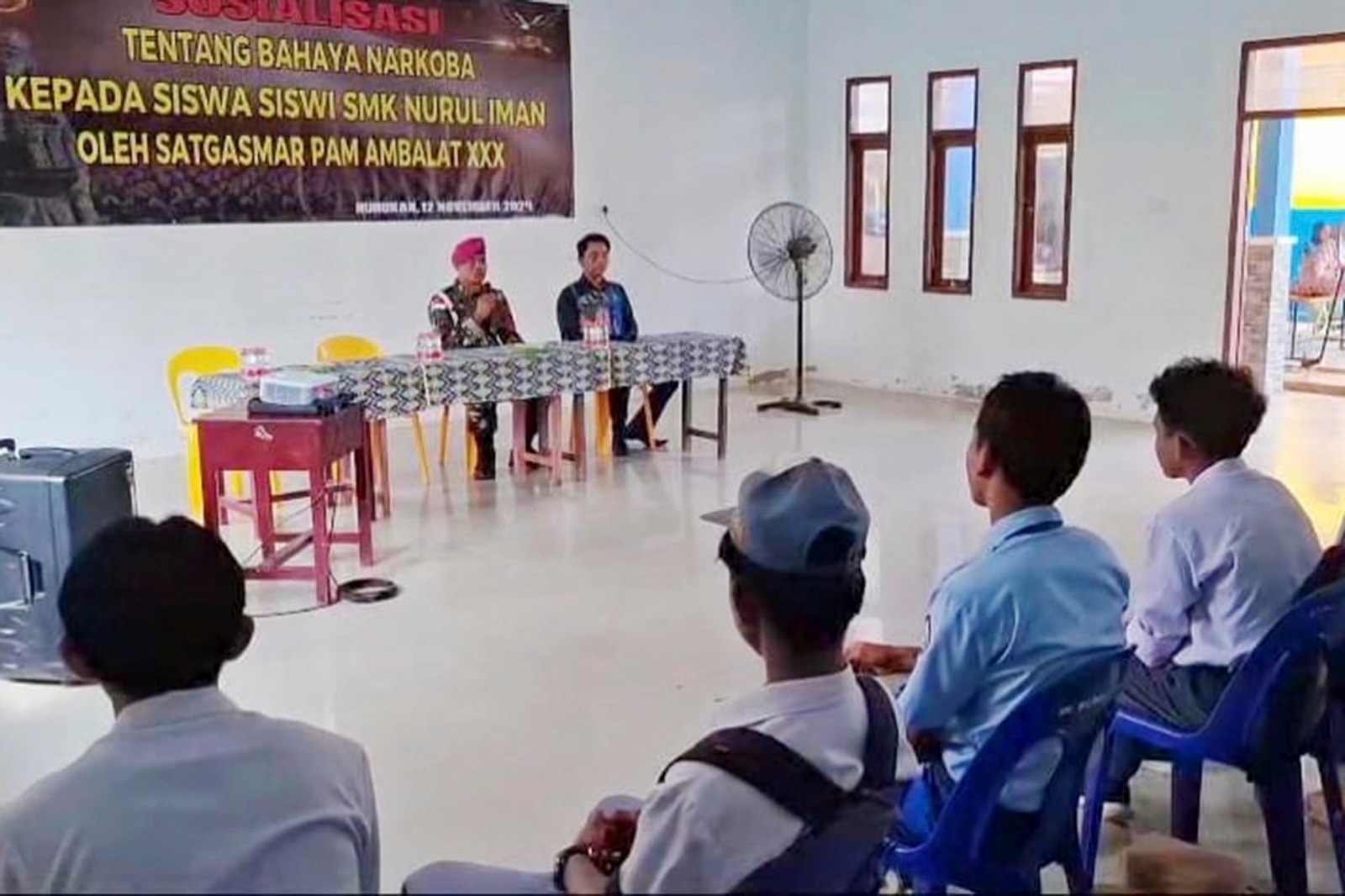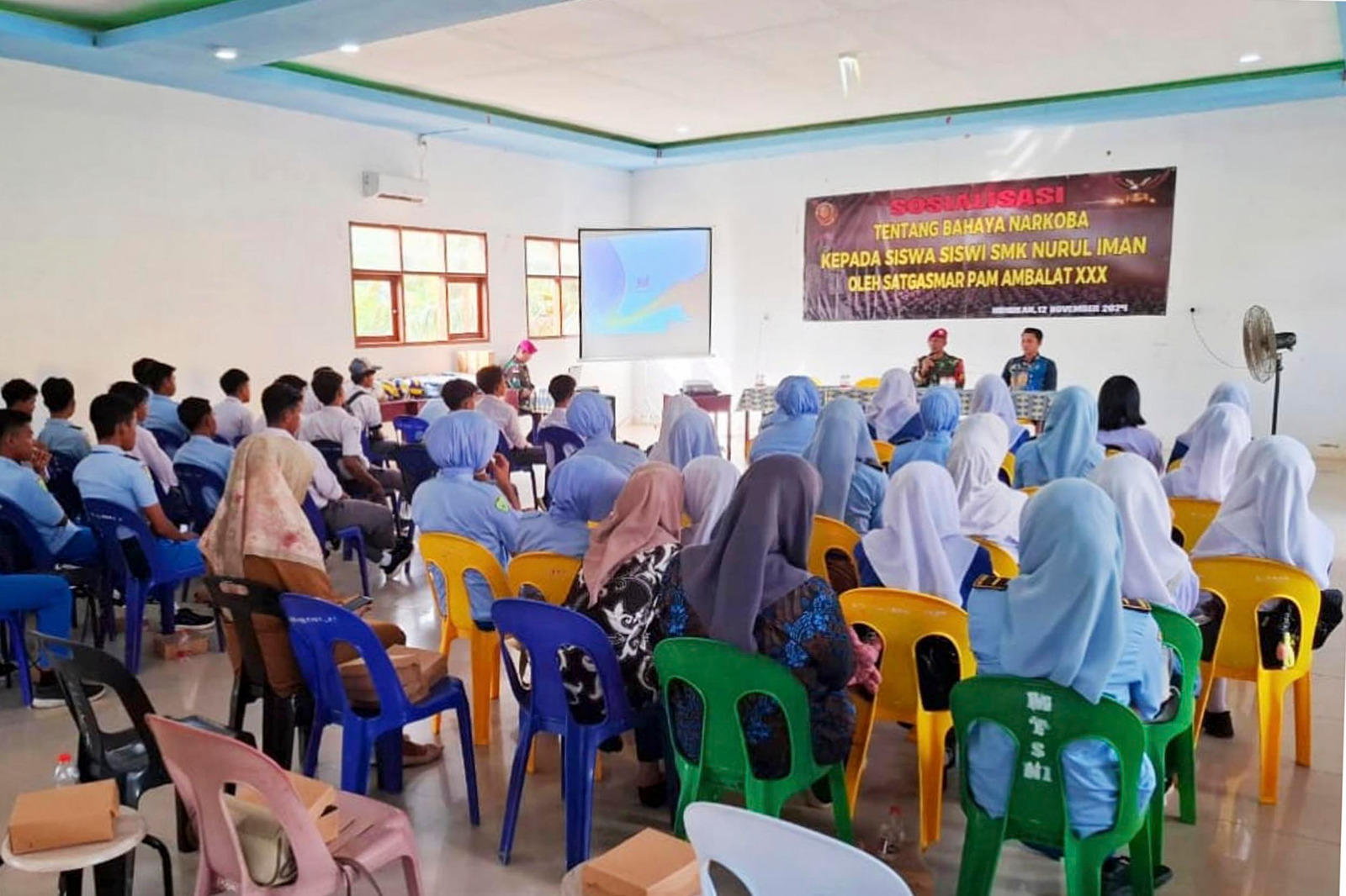 TNI AL, Dispen Kormar (Nunukan). Guna mencegah generasi muda tercemar dari penyalahgunaan Narkoba, Satgasmar Pam Ambalat XXX Bersama Badan Narkotika Nasional (BNN) mengadakan sosialisasi tentang Bahaya Narkoba kepada Siswa Siswi SMK Nurul Iman, Desa Tanjung Harapan, Sebatik, Nunukan, Kalimantan Utara. Selasa (12/11/2024).