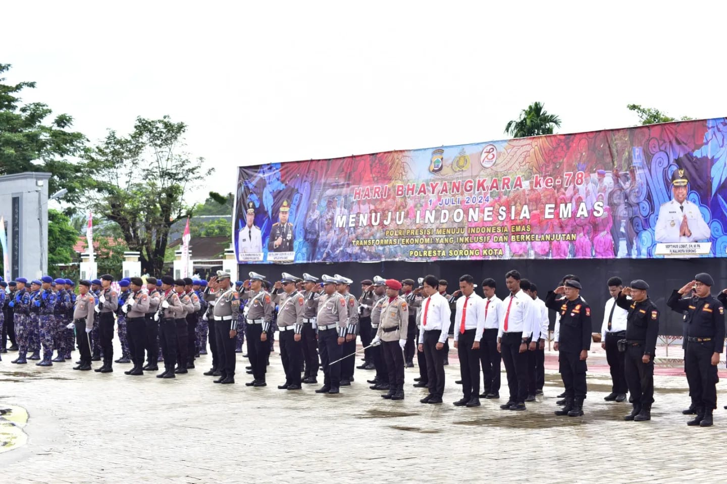 TNI AL, Dispen Kormar Sorong. Sinergitas TNI Prima dan Porli Presisi menuji Indonesia emas 2045, Wakil Komandan Pasmar 3 Kolonel David Candra Viasco, S.E., M.M., M.Sc., didampingi Wakil Ketua Korcab Jalasenastri Pasmar 3 Ny. Ratih David Candra Viasco menghadiri upacara peringatan Hari Ulang Tahun (HUT) Bhayangkara ke-78 bertempat di lapangan apel Kantor Walikota Sorong, Kel. Remu Utara, Distrik Sorong, Kota Sorong, Papua Barat Daya. Senin (01/07/2024).