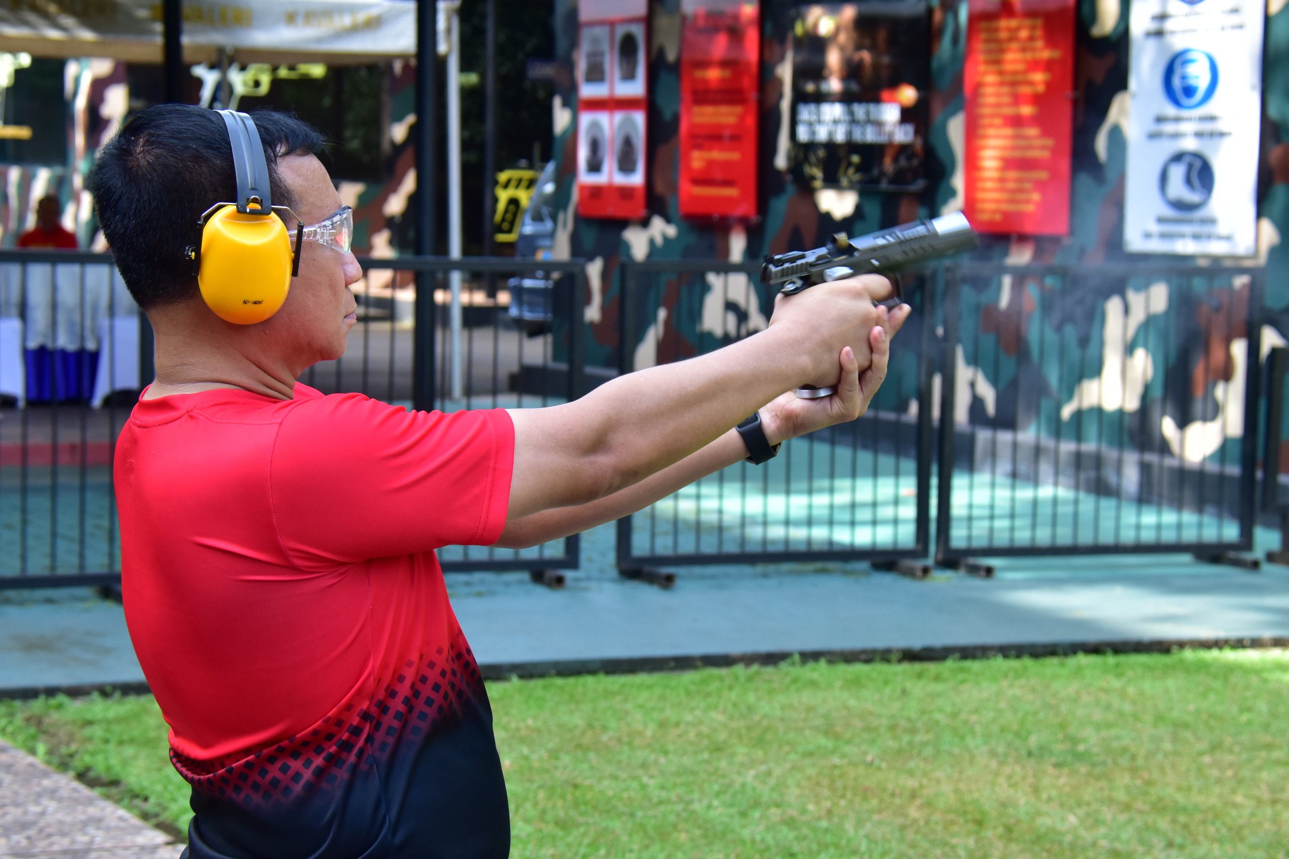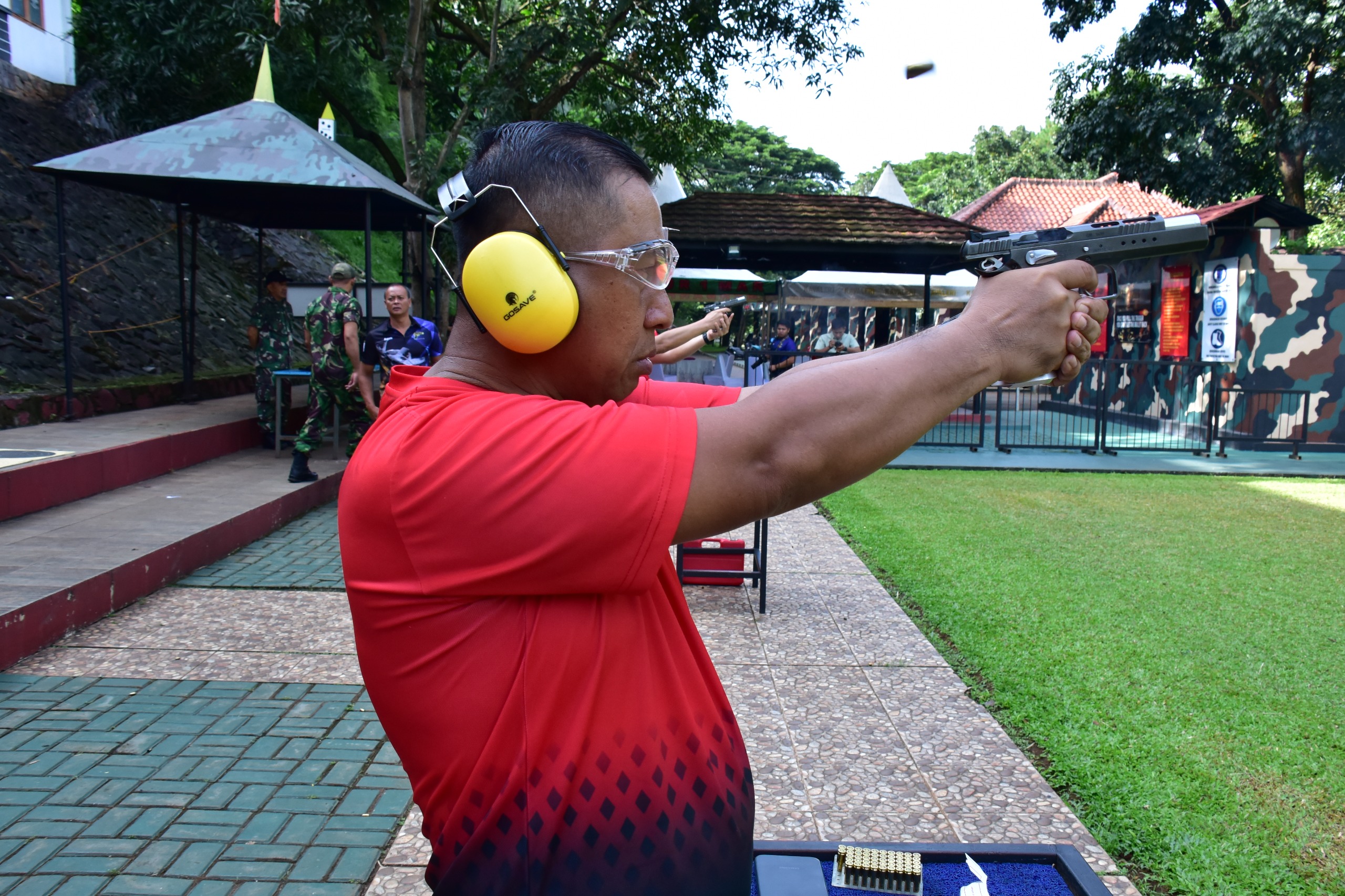 Latihan menembak pistol diawali dengan menembak pistol jarak 20 meter, terdiri dari menembak slow fire dalam waktu 3 menit dengan 10 butir amunisi dan rapid fire dengan waktu 63 detik dengan 10 butir amunisi serta tahap percobaan dalam waktu 60 detik dengan 3 butir amunisi.